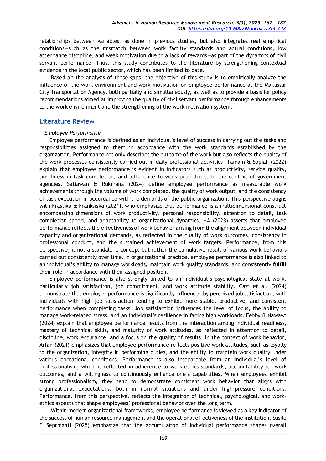 ADVANCESINRESEARCHADVANCESINRESEARCH Penelitian ini menunjukkan bahwa lingkungan kerja dan motivasi kerja secara signifikan memengaruhi kinerja karyawan di Dinas Perhubungan Kota Makassar.Penelitian ini menunjukkan bahwa lingkungan kerja dan motivasi kerja secara signifikan memengaruhi kinerja karyawan di Dinas Perhubungan Kota Makassar.