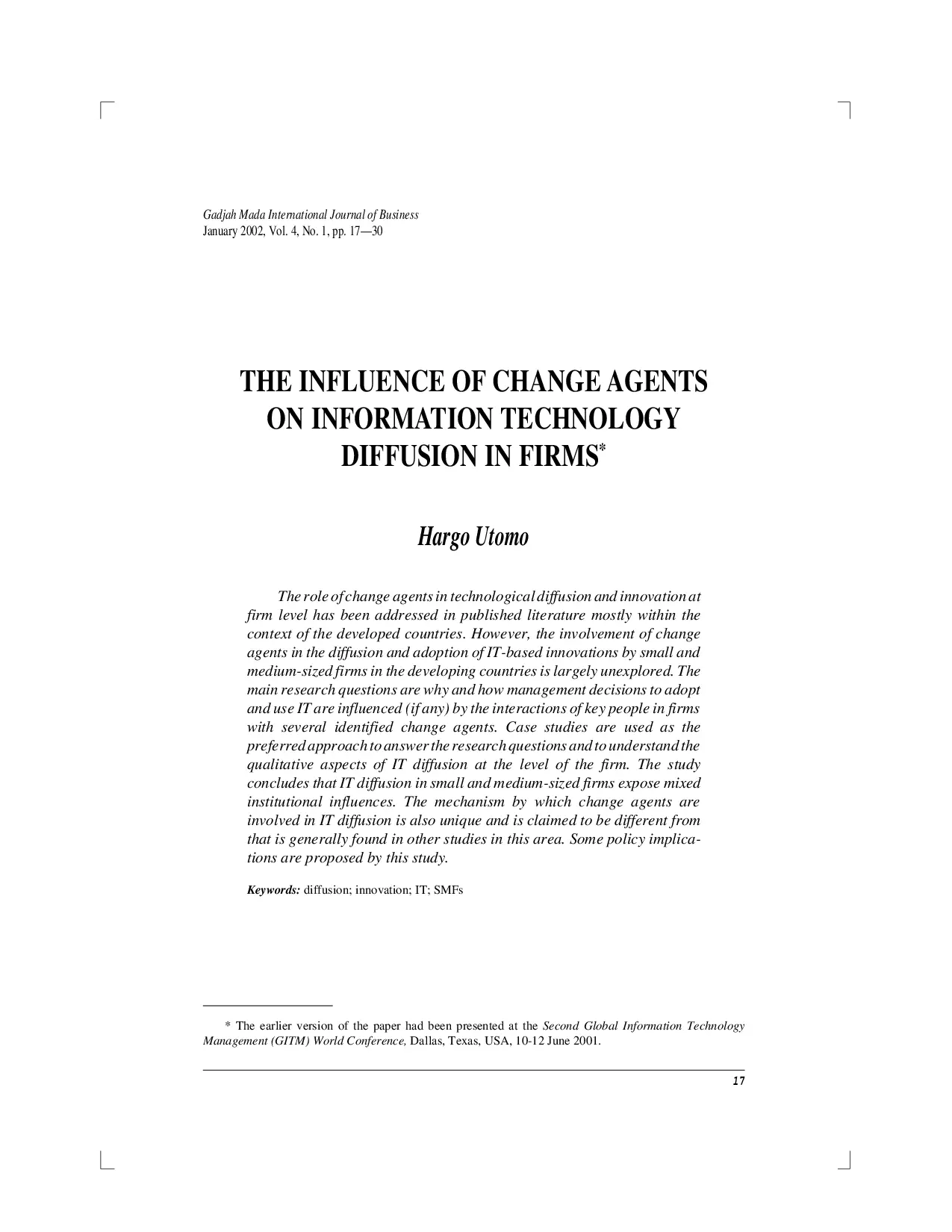 UGMUGM Namun, keterlibatan agen perubahan dalam difusi dan adopsi inovasi teknologi informasi (TI) oleh perusahaan kecil dan menengah (UKM) di negara berkembangNamun, keterlibatan agen perubahan dalam difusi dan adopsi inovasi teknologi informasi (TI) oleh perusahaan kecil dan menengah (UKM) di negara berkembang
