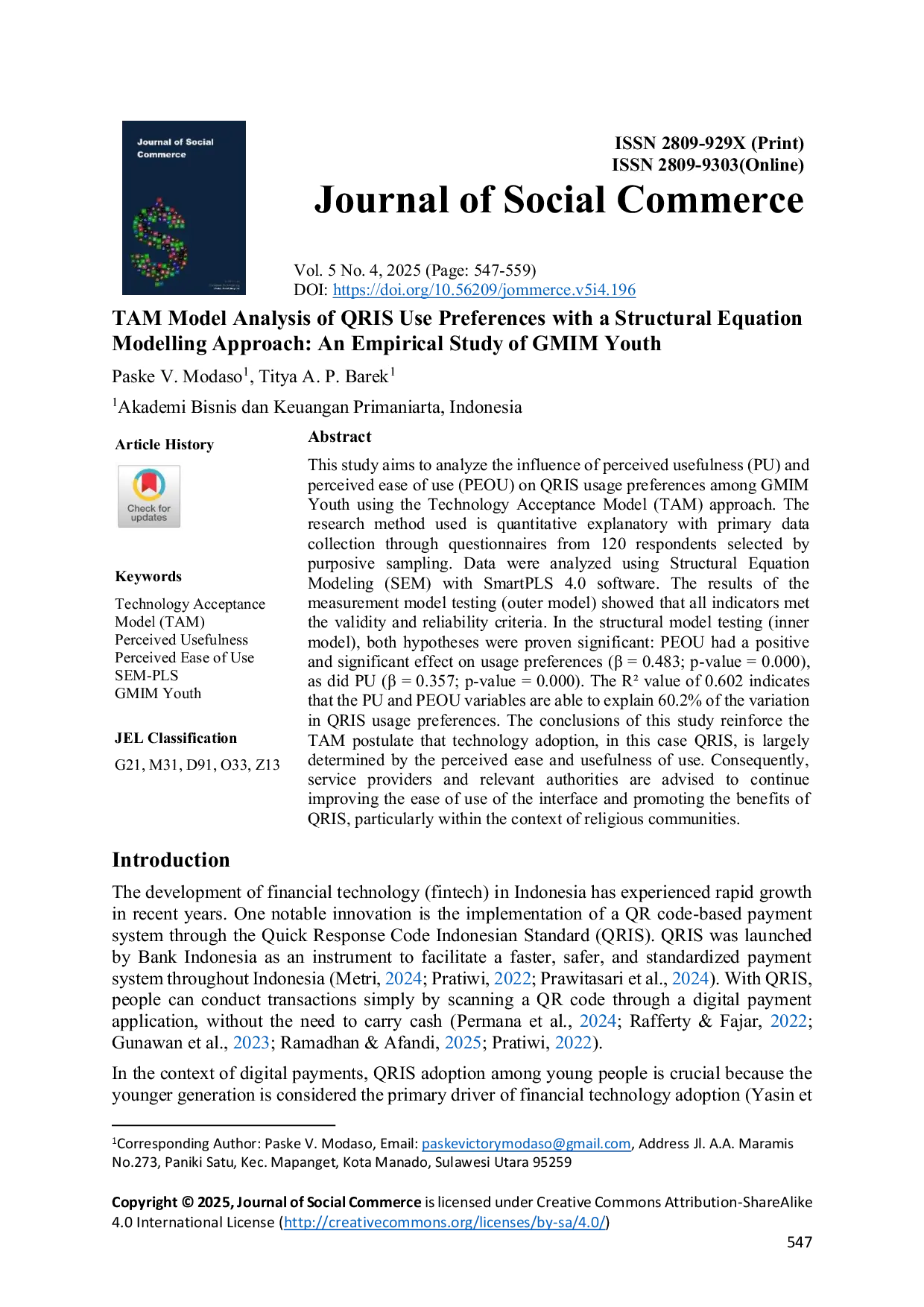 CELEBESSCHOLARPGCELEBESSCHOLARPG PU dan PEOU secara signifikan berpengaruh terhadap preferensi penggunaan QRIS, menjelaskan 60,2% variasi. Temuan mendukung TAM bahwa adopsi teknologi dipengaruhiPU dan PEOU secara signifikan berpengaruh terhadap preferensi penggunaan QRIS, menjelaskan 60,2% variasi. Temuan mendukung TAM bahwa adopsi teknologi dipengaruhi