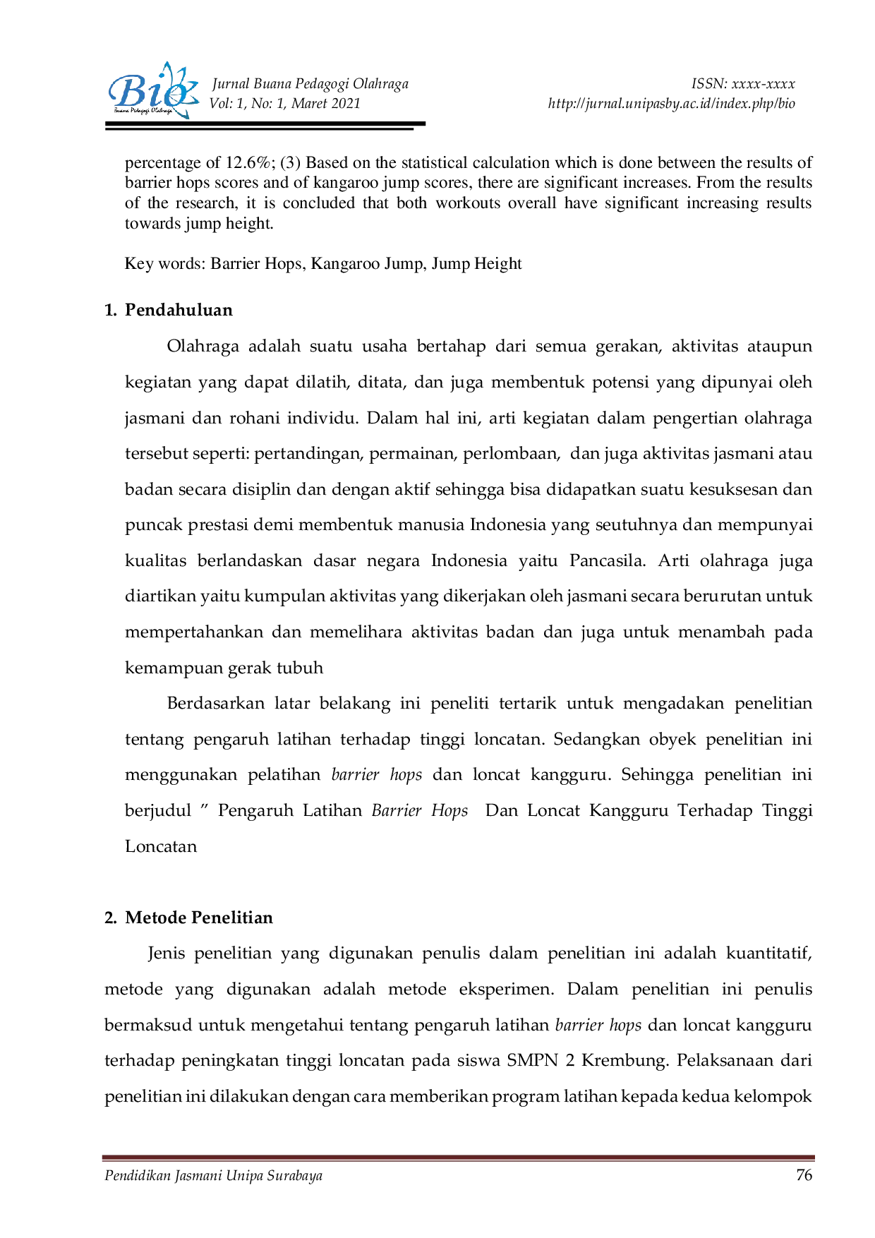 UNIPASBYUNIPASBY Dari hasil penelitian dapat disimpulkan: (1) terdapat peningkatan nilai posttest barrier hops (48,67) dibandingkan pretest (45,33) dengan kenaikan 7,3%;Dari hasil penelitian dapat disimpulkan: (1) terdapat peningkatan nilai posttest barrier hops (48,67) dibandingkan pretest (45,33) dengan kenaikan 7,3%;
