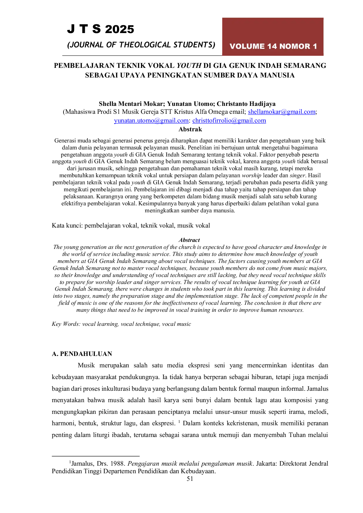 STTKAOSTTKAO Penelitian ini bertujuan untuk mengetahui bagaimana pengetahuan anggota youth di GIA Genuk Indah Semarang tentang teknik vokal. Faktor penyebab pesertaPenelitian ini bertujuan untuk mengetahui bagaimana pengetahuan anggota youth di GIA Genuk Indah Semarang tentang teknik vokal. Faktor penyebab peserta