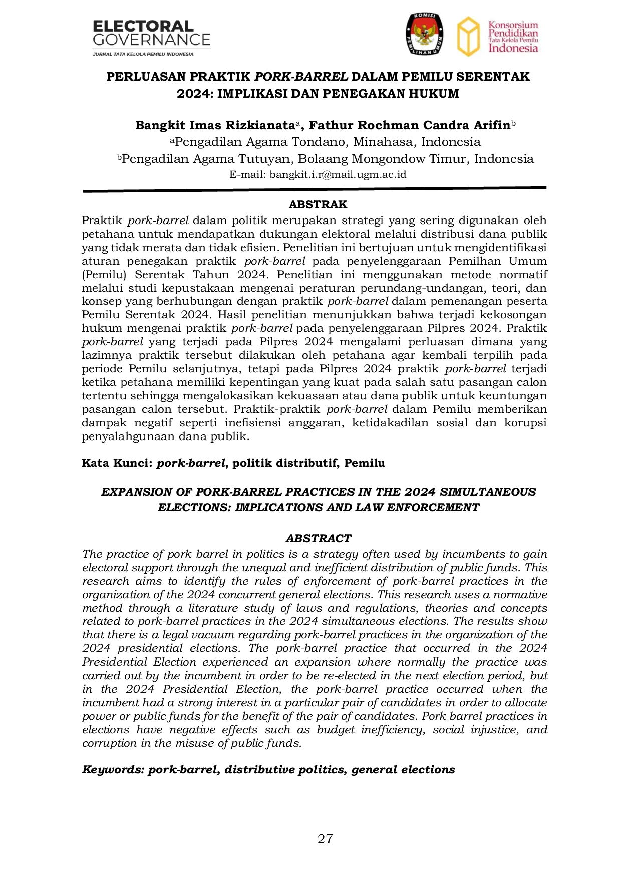 KPUKPU Hasil penelitian menunjukkan adanya kekosongan hukum mengenai praktik pork-barrel pada penyelenggaraan Pilpres 2024, di mana praktik ini mengalami perluasanHasil penelitian menunjukkan adanya kekosongan hukum mengenai praktik pork-barrel pada penyelenggaraan Pilpres 2024, di mana praktik ini mengalami perluasan