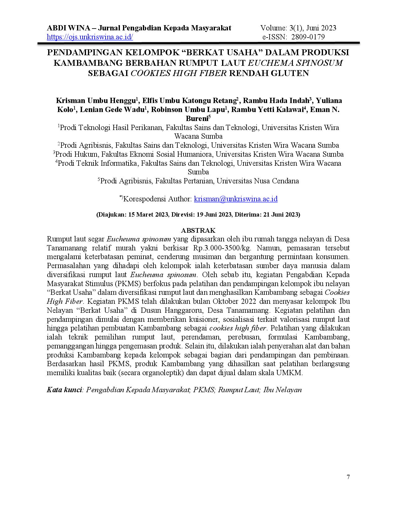 UNKRISWINAUNKRISWINA Kegiatan pelatihan dan pendampingan dimulai dengan memberikan kuisioner, sosialisasi terkait valorisasi rumput laut hingga pelatihan pembuatan KambambangKegiatan pelatihan dan pendampingan dimulai dengan memberikan kuisioner, sosialisasi terkait valorisasi rumput laut hingga pelatihan pembuatan Kambambang