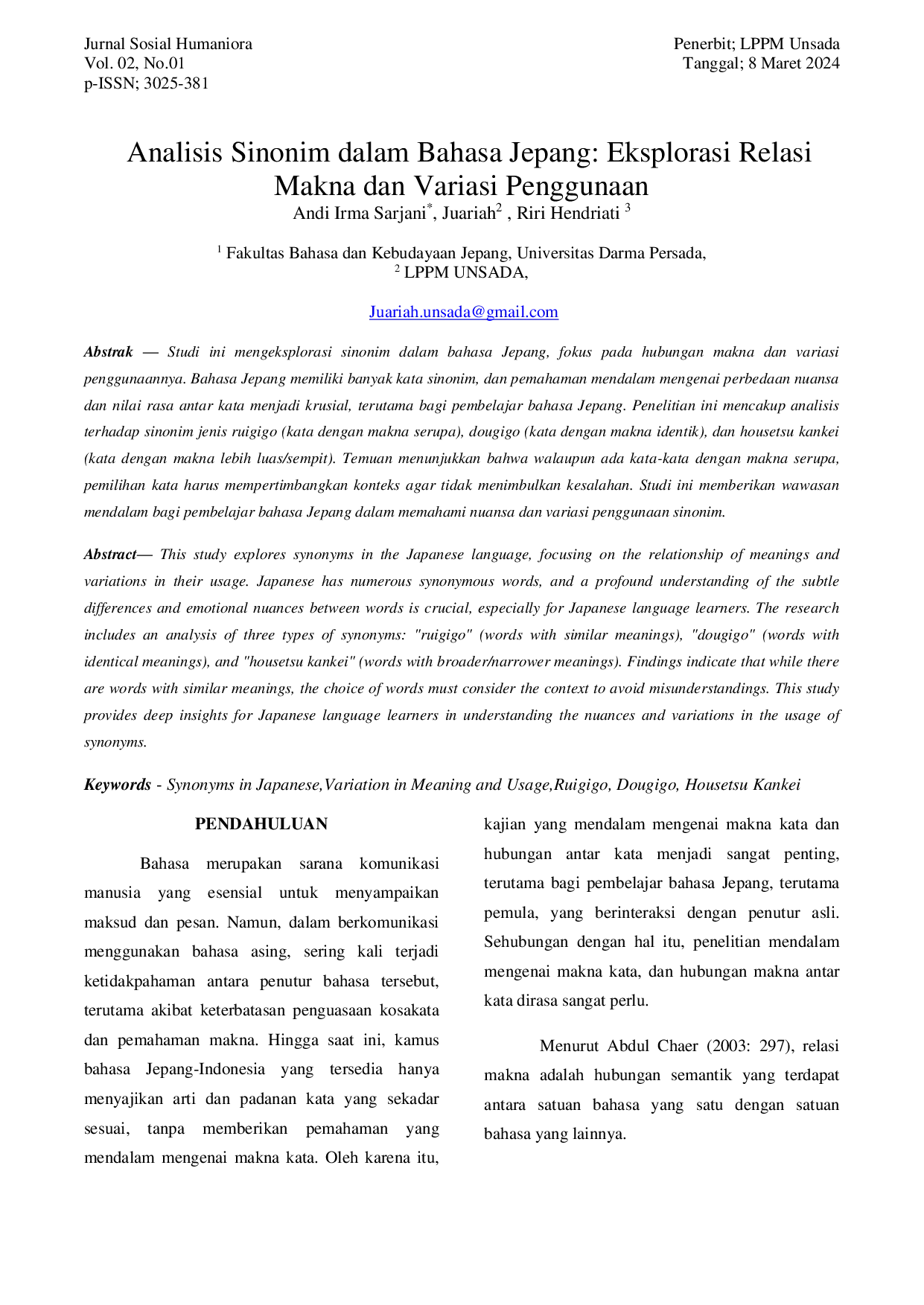 UNSADAUNSADA Penelitian ini menunjukkan bahwa dalam ruang lingkup sinonim bahasa Jepang terdapat tiga jenis sinonim yang dibedakan menurut tingkat kesamaan maknanya,Penelitian ini menunjukkan bahwa dalam ruang lingkup sinonim bahasa Jepang terdapat tiga jenis sinonim yang dibedakan menurut tingkat kesamaan maknanya,