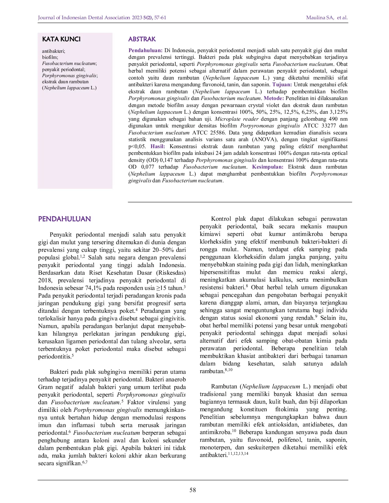 PDGIPDGI Tujuan: Untuk mengetahui efek ekstrak daun rambutan (Nephelium lappaceum L. ) terhadap pembentukkan biofilm Porphyromonas gingivalis dan FusobacteriumTujuan: Untuk mengetahui efek ekstrak daun rambutan (Nephelium lappaceum L. ) terhadap pembentukkan biofilm Porphyromonas gingivalis dan Fusobacterium
