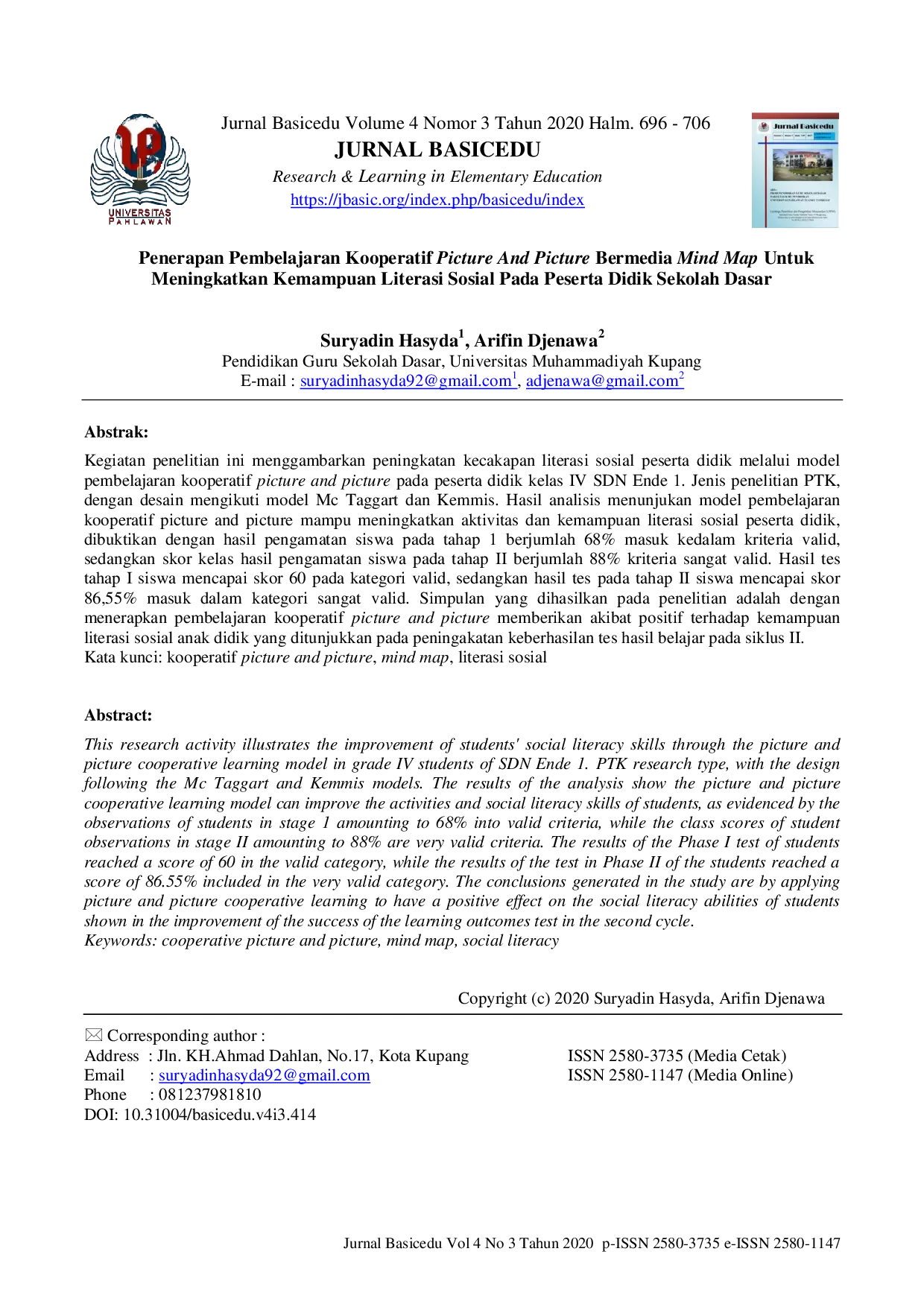 JBASICJBASIC Penelitian ini bertujuan untuk meningkatkan kemampuan literasi sosial siswa kelas IV SDN Ende 1 melalui model pembelajaran kooperatif picture and picture.Penelitian ini bertujuan untuk meningkatkan kemampuan literasi sosial siswa kelas IV SDN Ende 1 melalui model pembelajaran kooperatif picture and picture.