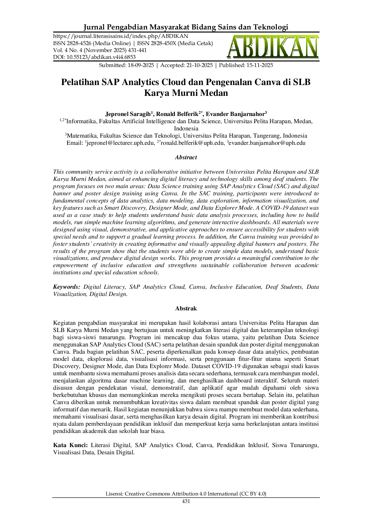 LITERASISAINSLITERASISAINS Kegiatan pengabdian masyarakat ini merupakan hasil kolaborasi antara Universitas Pelita Harapan dan SLB Karya Murni Medan yang bertujuan untuk meningkatkanKegiatan pengabdian masyarakat ini merupakan hasil kolaborasi antara Universitas Pelita Harapan dan SLB Karya Murni Medan yang bertujuan untuk meningkatkan