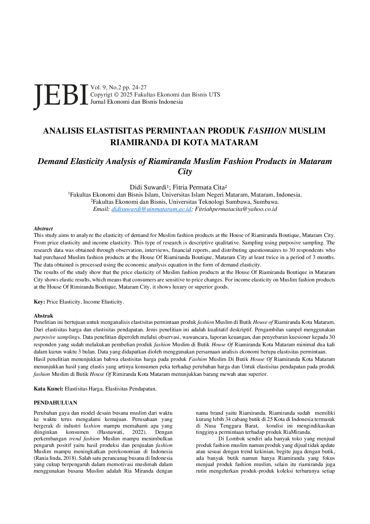 UTSUTS Hasil penelitian menunjukkan bahwa elastisitas harga pada produk Fashion Muslim Di Butik House Of Riamiranda Kota Mataram menunjukkan hasil yang elastisHasil penelitian menunjukkan bahwa elastisitas harga pada produk Fashion Muslim Di Butik House Of Riamiranda Kota Mataram menunjukkan hasil yang elastis
