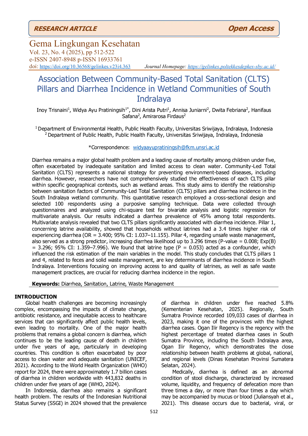 POLTEKKESDEPKES SBYPOLTEKKESDEPKES SBY Penelitian ini bertujuan untuk mengidentifikasi hubungan antara faktor sanitasi pilar CLTS dan insiden diare di komunitas rawa Indralaya Selatan. PenelitianPenelitian ini bertujuan untuk mengidentifikasi hubungan antara faktor sanitasi pilar CLTS dan insiden diare di komunitas rawa Indralaya Selatan. Penelitian