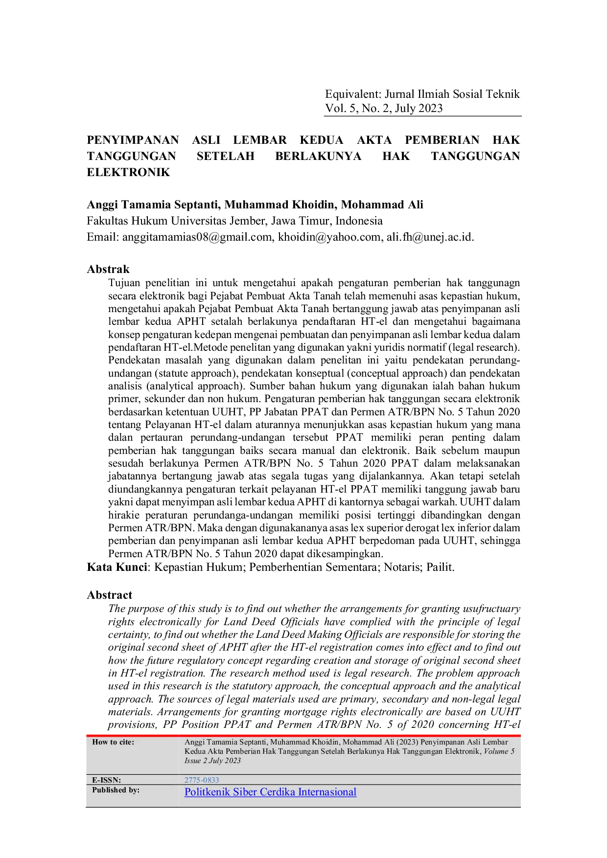 JURNALEQUIVALENTJURNALEQUIVALENT 5 Tahun 2020 tentang Pelayanan HT-el dalam aturannya menunjukkan asas kepastian hukum yang mana dalan pertauran perundang-undangan tersebut PPAT memiliki5 Tahun 2020 tentang Pelayanan HT-el dalam aturannya menunjukkan asas kepastian hukum yang mana dalan pertauran perundang-undangan tersebut PPAT memiliki