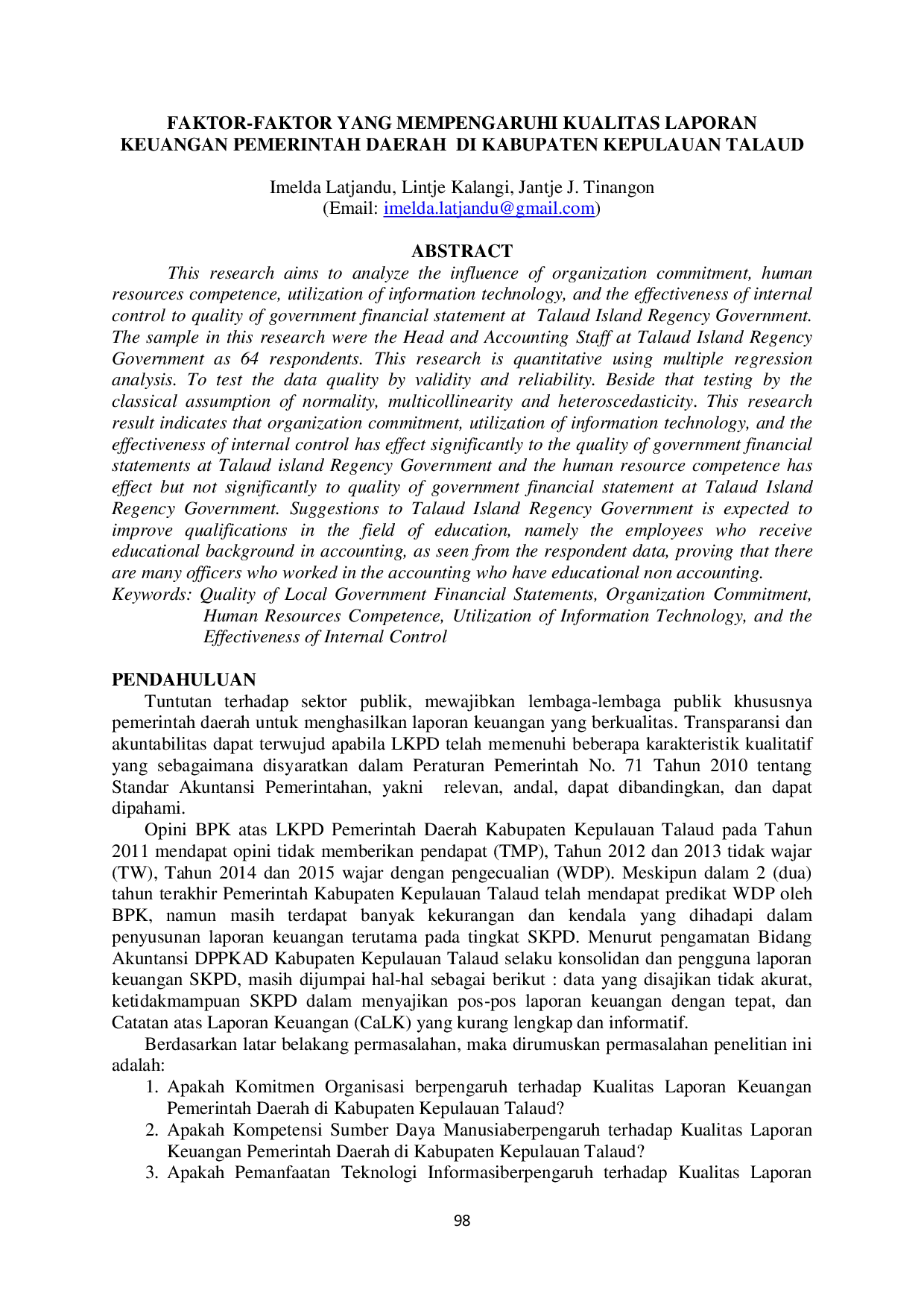 UNSRATUNSRAT The sample in this study amounted to 230 LKPD 2014 throughout Indonesia and used multinomial logistic regression analysis. This study used secondary dataThe sample in this study amounted to 230 LKPD 2014 throughout Indonesia and used multinomial logistic regression analysis. This study used secondary data