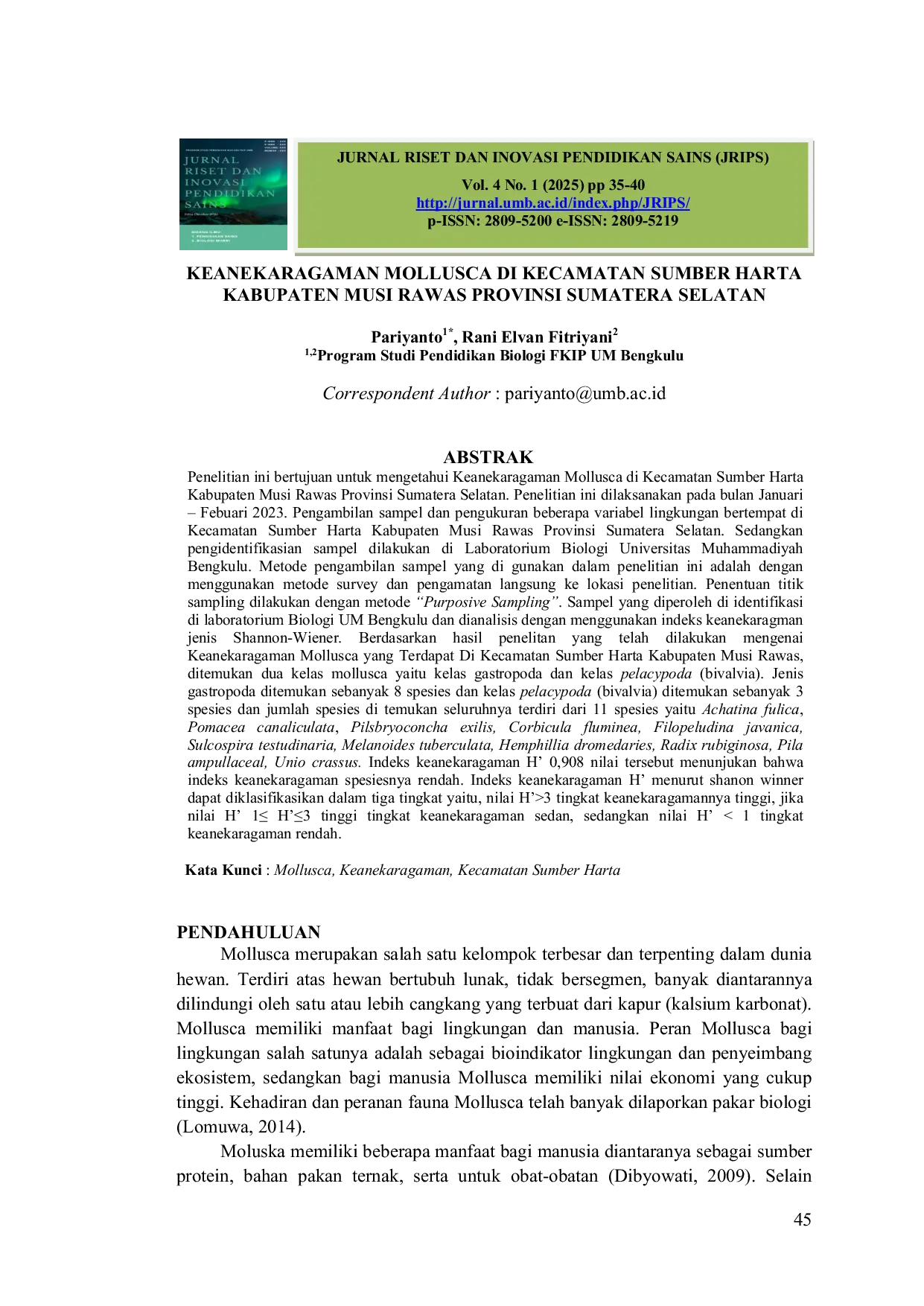 UMBUMB Kelembapan tanah teridentifikasi berpengaruh signifikan terhadap distribusi mollusca. Mollusca di Kecamatan Sumber Harta terdiri atas 2 kelas, 8 ordo,Kelembapan tanah teridentifikasi berpengaruh signifikan terhadap distribusi mollusca. Mollusca di Kecamatan Sumber Harta terdiri atas 2 kelas, 8 ordo,