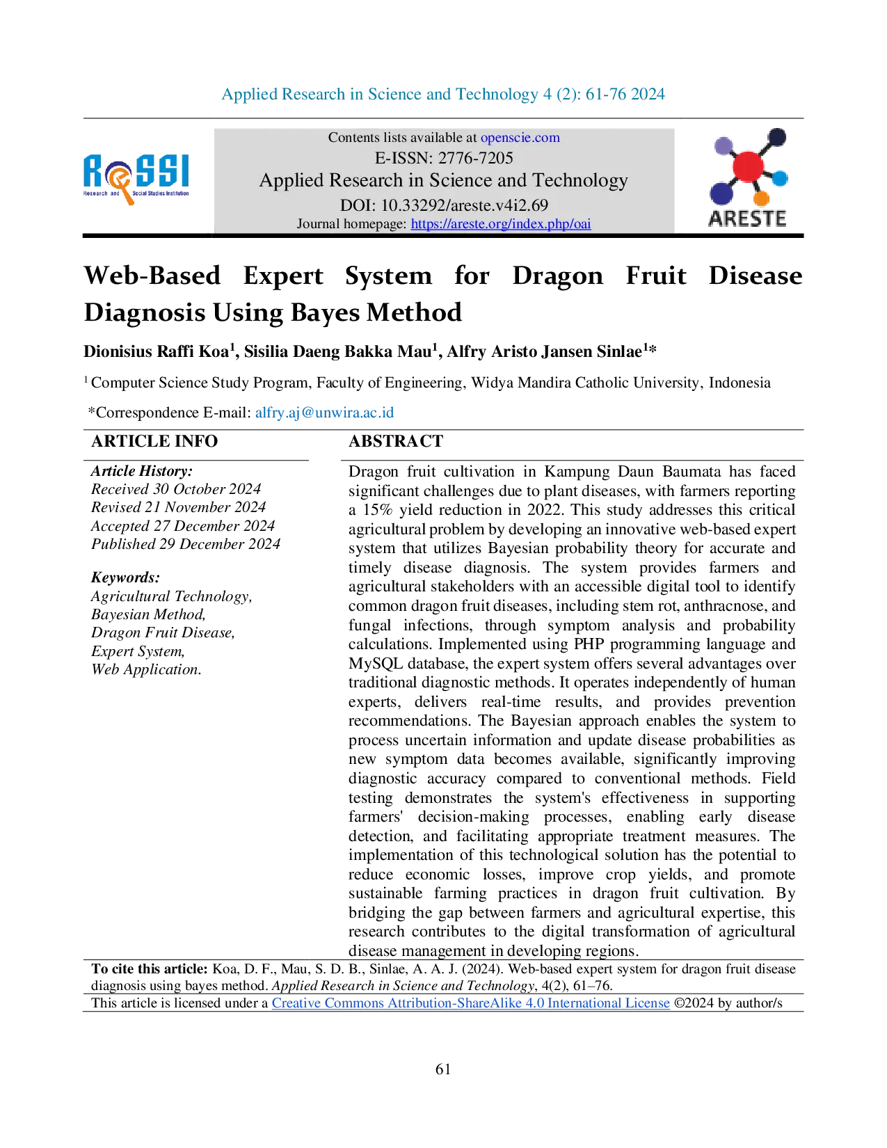 ARESTEARESTE Berdasarkan analisis dan pengujian yang telah dilakukan, dapat disimpulkan bahwa aplikasi sistem pakar untuk mendiagnosis penyakit pada tanaman buah nagaBerdasarkan analisis dan pengujian yang telah dilakukan, dapat disimpulkan bahwa aplikasi sistem pakar untuk mendiagnosis penyakit pada tanaman buah naga
