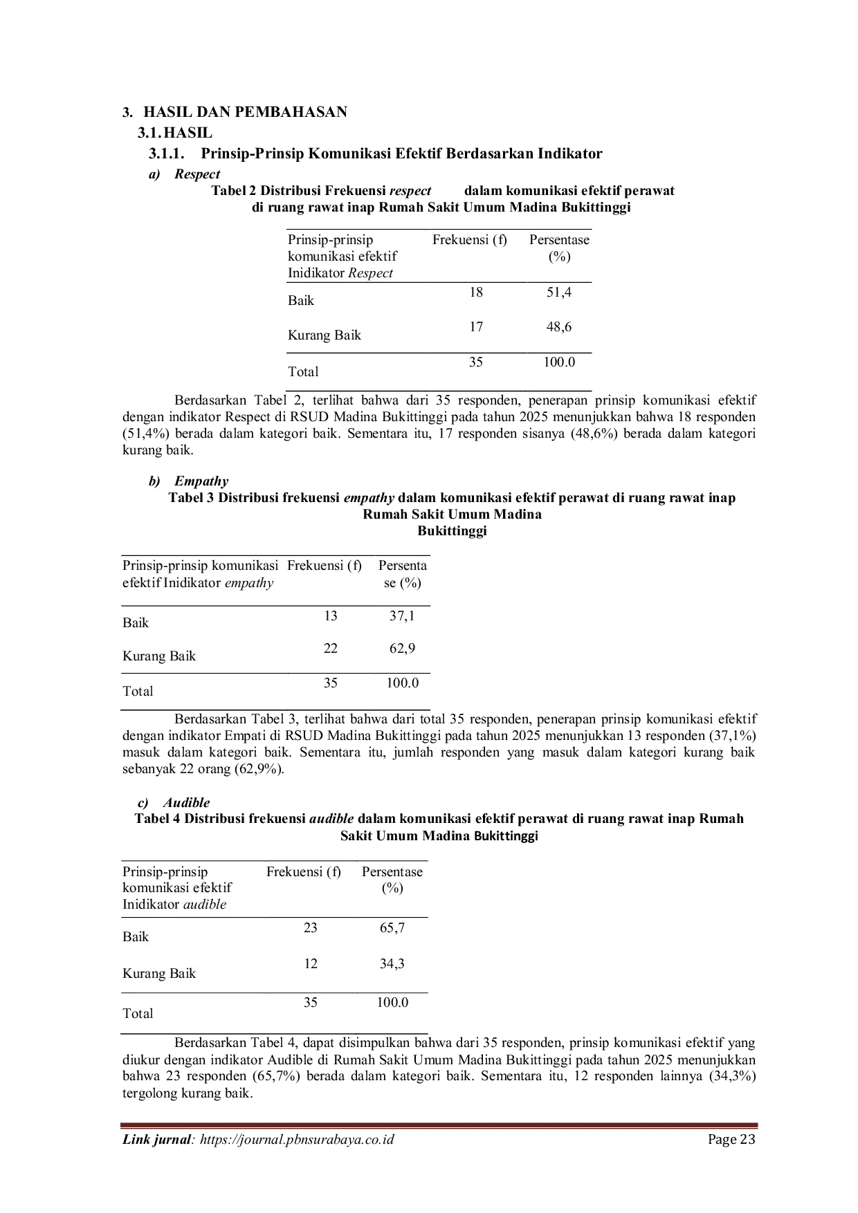 PBNSURABAYAPBNSURABAYA Komunikasi yang dilakukan secara empatik dan profesional oleh perawat mampu meningkatkan kepercayaan dan kenyamanan pasien. Meskipun mayoritas pasien menyatakanKomunikasi yang dilakukan secara empatik dan profesional oleh perawat mampu meningkatkan kepercayaan dan kenyamanan pasien. Meskipun mayoritas pasien menyatakan