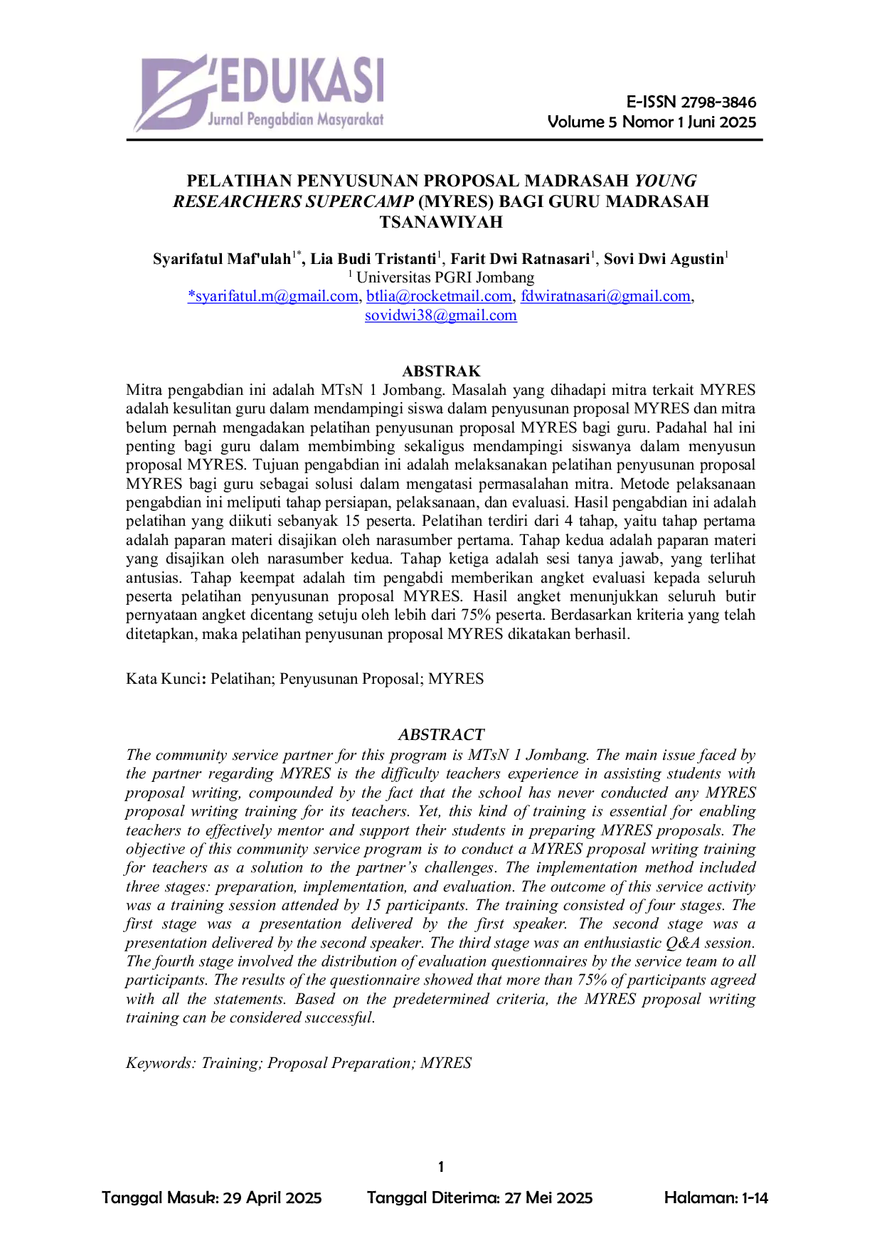 UNIPMAUNIPMA Mitra pengabdian ini adalah MTsN 1 Jombang. Masalah yang dihadapi mitra terkait MYRES adalah kesulitan guru dalam mendampingi siswa dalam penyusunan proposalMitra pengabdian ini adalah MTsN 1 Jombang. Masalah yang dihadapi mitra terkait MYRES adalah kesulitan guru dalam mendampingi siswa dalam penyusunan proposal