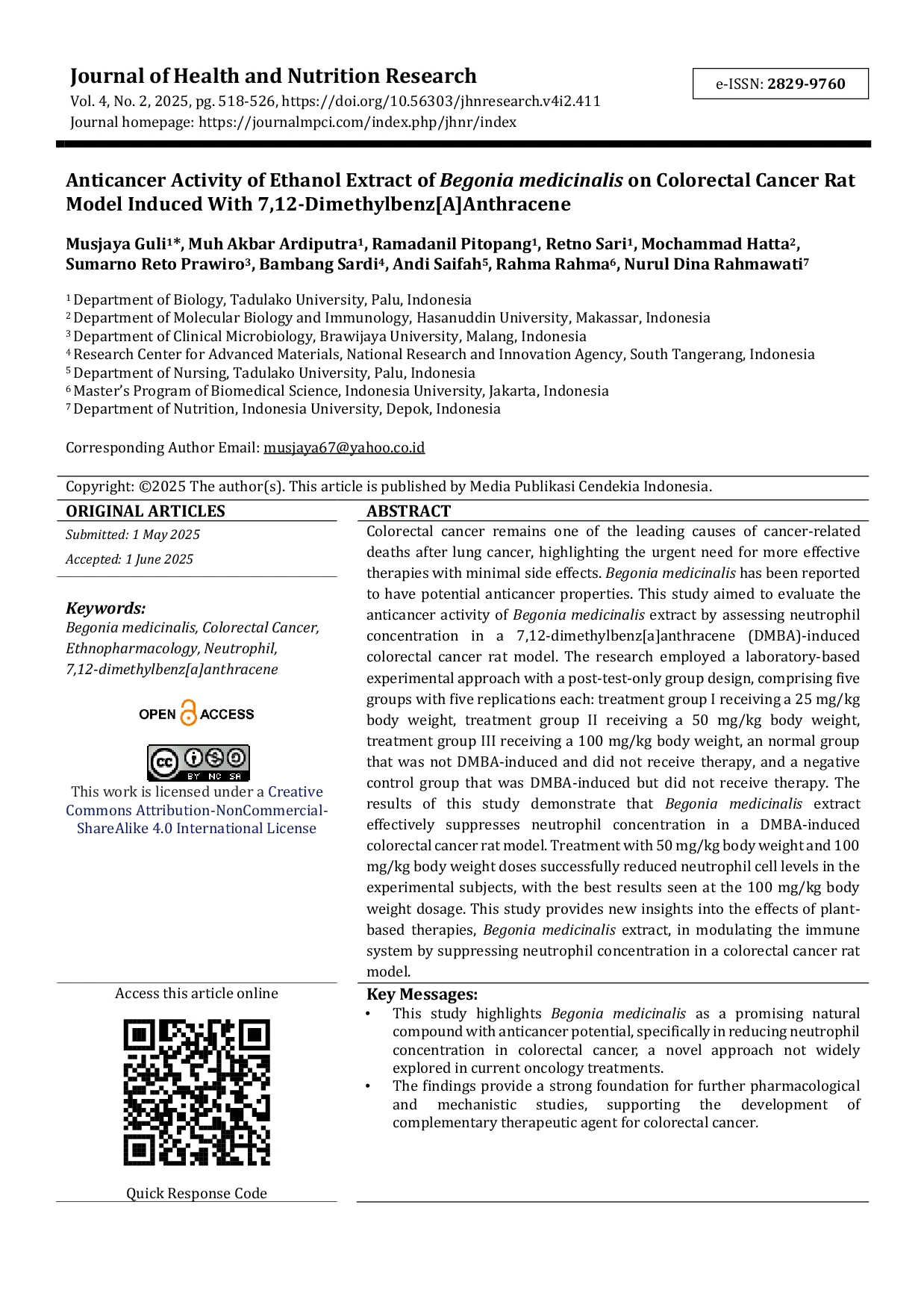 JOURNALMPCIJOURNALMPCI Ekstrak Begonia medicinalis dilaporkan memiliki potensi antikanker. Studi ini bertujuan untuk mengevaluasi aktivitas antikanker dari ekstrak Begonia medicinalisEkstrak Begonia medicinalis dilaporkan memiliki potensi antikanker. Studi ini bertujuan untuk mengevaluasi aktivitas antikanker dari ekstrak Begonia medicinalis