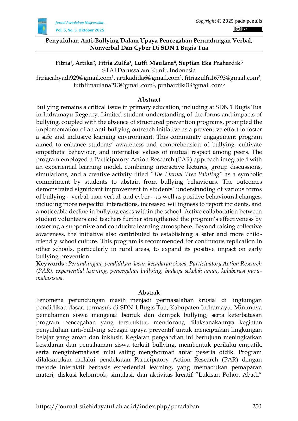 JOURNAL STIEHIDAYATULLAHJOURNAL STIEHIDAYATULLAH Beyond raising collective awareness, the initiative also contributed to establishing a safer and more child-friendly school culture. This program is recommendedBeyond raising collective awareness, the initiative also contributed to establishing a safer and more child-friendly school culture. This program is recommended