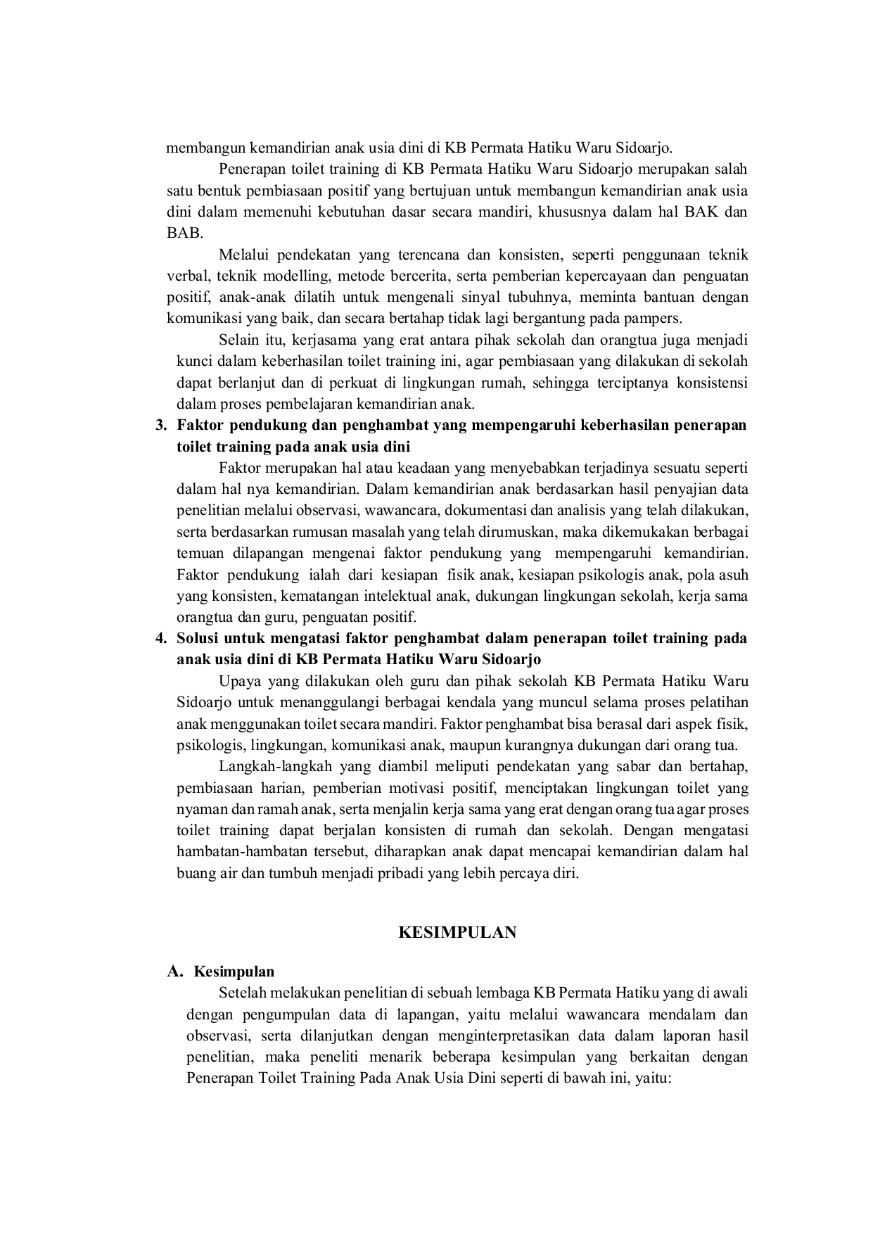 STAI YPBWISTAI YPBWI Penerapan toilet training pada anak usia dini di KB Permata Hatiku Waru Sidoarjo membutuhkan perencanaan pengajaran, pelaksanaan, dan evaluasi. FaktorPenerapan toilet training pada anak usia dini di KB Permata Hatiku Waru Sidoarjo membutuhkan perencanaan pengajaran, pelaksanaan, dan evaluasi. Faktor