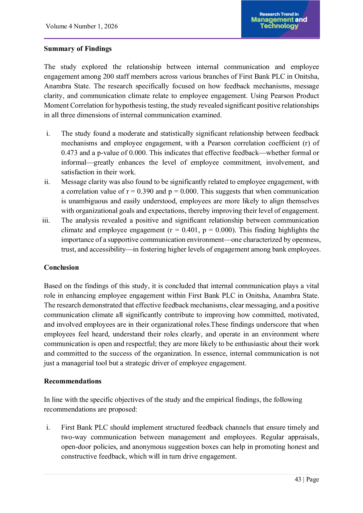 RTT JOURNALRTT JOURNAL The findings revealed significant positive relationships between feedback mechanisms, message clarity, communication climate, and employee engagement.The findings revealed significant positive relationships between feedback mechanisms, message clarity, communication climate, and employee engagement.