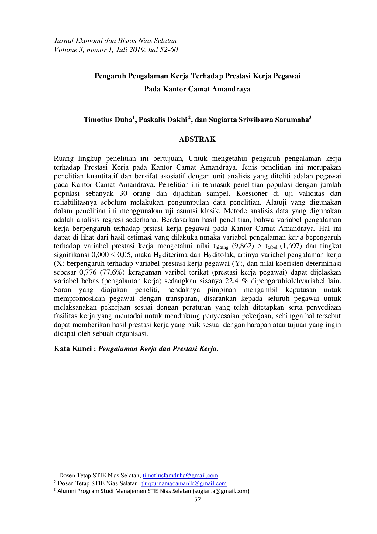 UNIRAYAUNIRAYA 862) > ttabel (1,697) dan tingkat signifikansi 0,000 < 0,05, maka Ha diterimadan H0 ditolak, artinya bahwa secara parsial variabel pengalaman kerja berpengaruh862) > ttabel (1,697) dan tingkat signifikansi 0,000 < 0,05, maka Ha diterimadan H0 ditolak, artinya bahwa secara parsial variabel pengalaman kerja berpengaruh