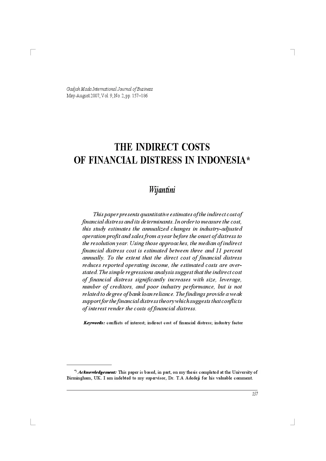UGMUGM Penelitian ini menyajikan estimasi kuantitatif biaya tidak langsung distress keuangan serta faktor‑faktornya. Untuk mengukur biaya, studi ini memperkirakanPenelitian ini menyajikan estimasi kuantitatif biaya tidak langsung distress keuangan serta faktor‑faktornya. Untuk mengukur biaya, studi ini memperkirakan