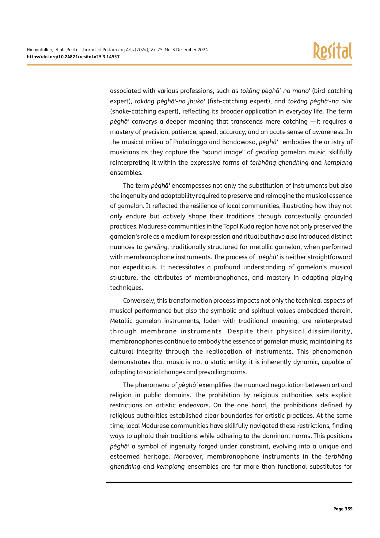 ISI YogyakartaISI Yogyakarta Penelitian ini mengeksplorasi fenomena pèghâ dalam tradisi musik terbhâng ghendhing dan kemplang di Probolinggo dan Bondowoso, Jawa Timur. Pèghâ merujukPenelitian ini mengeksplorasi fenomena pèghâ dalam tradisi musik terbhâng ghendhing dan kemplang di Probolinggo dan Bondowoso, Jawa Timur. Pèghâ merujuk