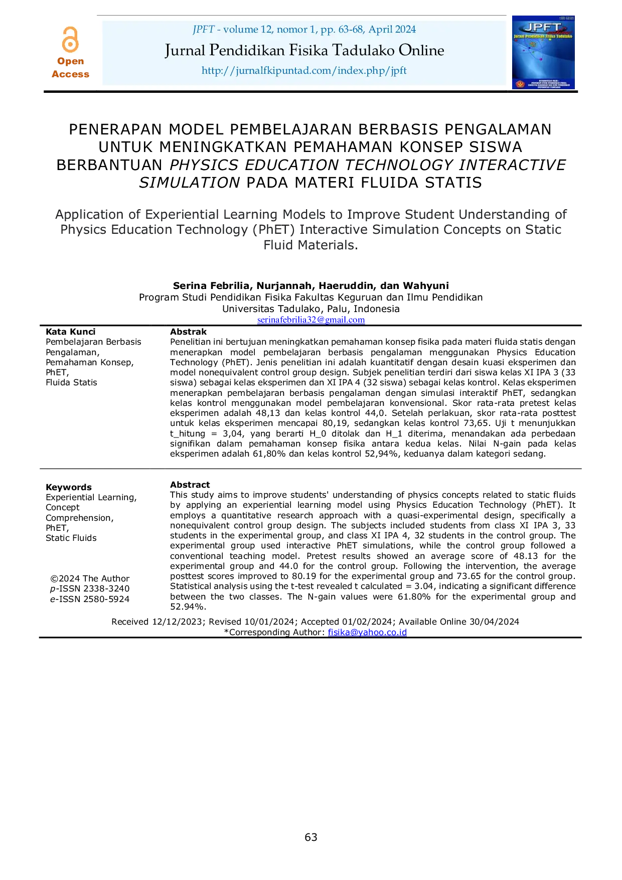 JURNALFKIPUNTADJURNALFKIPUNTAD Kelas eksperimen menerapkan pembelajaran berbasis pengalaman dengan simulasi interaktif PhET, sedangkan kelas kontrol menggunakan model pembelajaran konvensional.Kelas eksperimen menerapkan pembelajaran berbasis pengalaman dengan simulasi interaktif PhET, sedangkan kelas kontrol menggunakan model pembelajaran konvensional.
