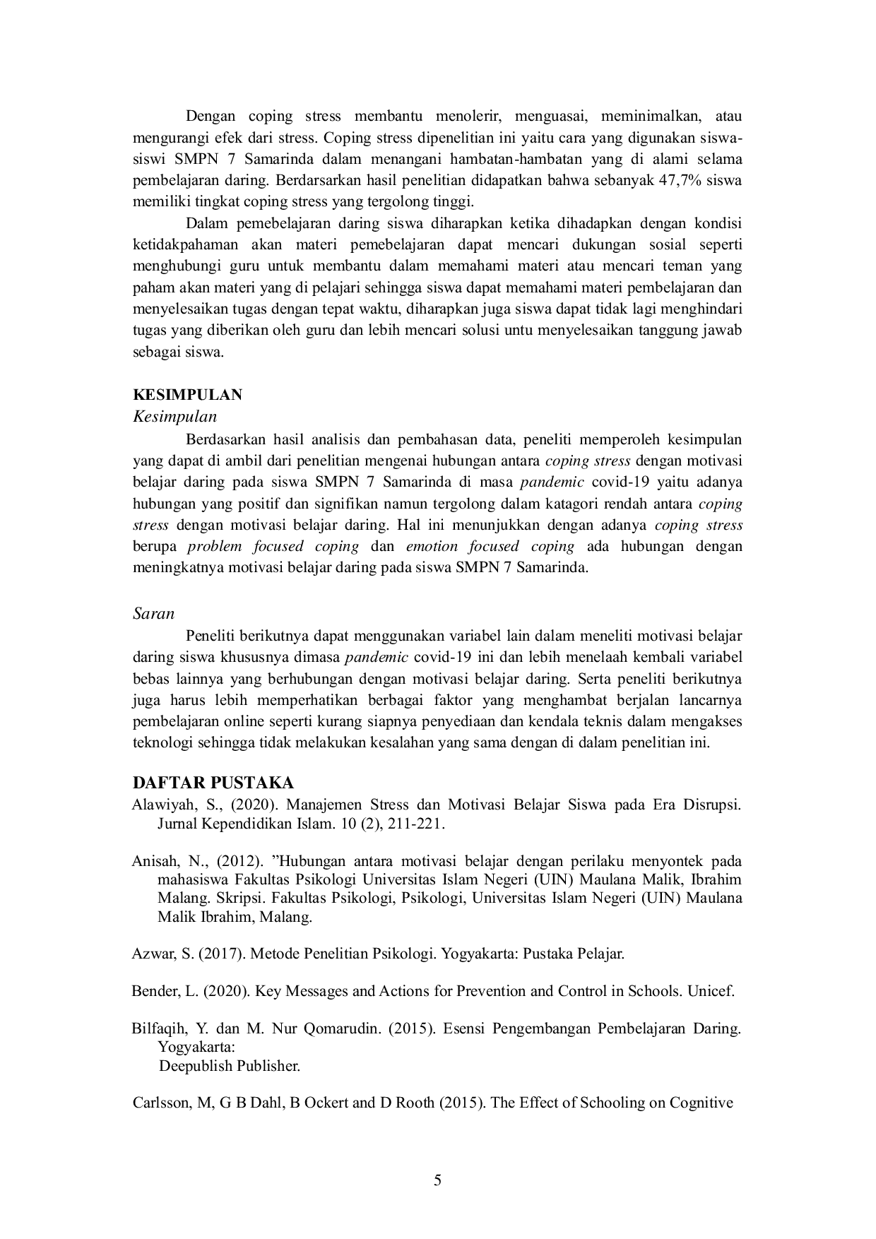 UNTAG SMDUNTAG SMD Penelitian ini bertujuan untuk mengetahui hubungan antara coping stress dengan motivasi belajar daring pada siswa SMPN 7 Samarinda di masa pandemi covid-19.Penelitian ini bertujuan untuk mengetahui hubungan antara coping stress dengan motivasi belajar daring pada siswa SMPN 7 Samarinda di masa pandemi covid-19.