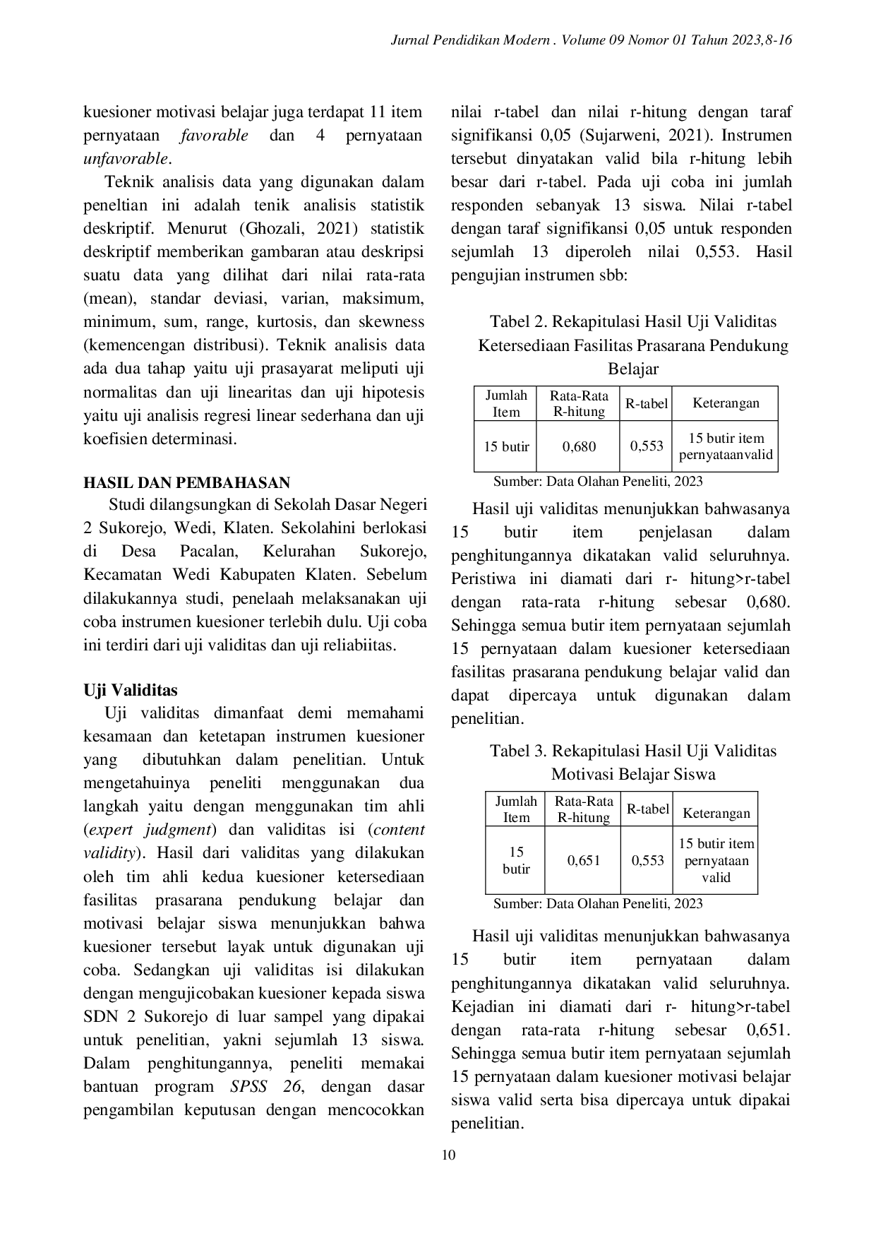 Jurnal Pendidikan ModernJurnal Pendidikan ModernPenelitian ini dilandasi akibat minimnya motivasi belajar siswa yang ditunjukkan dengan kurangnya semangat ke sekolah, bosan, dan kurang tertarik saat mengikuti kegiatan belajar di kelas. Peristiwa ini disebabkan oleh kurangnya ketersediaan fasilitas prasarana pendukung belajar, seperti kondisi gedung sekolah yang kurang baik, kondisi ruang kelas, dan keberfungsian perpustakaan yang belum maksimal. Tujuan penelitian ini ialah untuk menyadari dampak ketersediaan fasilitas prasarana pendukung belajar terhadap motivasi belajar siswa di SDN 2 Sukorejo Wedi Klaten. Pendekatan penelitian ini ialah pendekatan kuantitatif dengan metode penelitian ex-post facto. Populasi penelitian yakni siswa kelas IV, V dan VI sebanyak 43 siswa. Pemilihan sampel dilangsungkan dengan teknik stratified random sampling & banyak sampel menjadi 30 siswa. Pengambilan data dilaksanakan memanfaatkan kuesioner serta dokumentasi. Hasil studi ini menunjukkan nilai signifikansi sebanyak 0,000 lebih kecil dari probabilitas 0,05. Koefisien determinasi dari hasil penelitian ini sebanyak 0,463 yang artinya ketersediaan fasilitas prasarana pendukung belajar di SDN 2 Sukorejo Wedi Klaten memberikan sumbangan positif terhadap motivasi belajar siswa sebesar 46,3%, lebihnya didorong karena faktor lain yang tak termasuk pada penelitian ini.