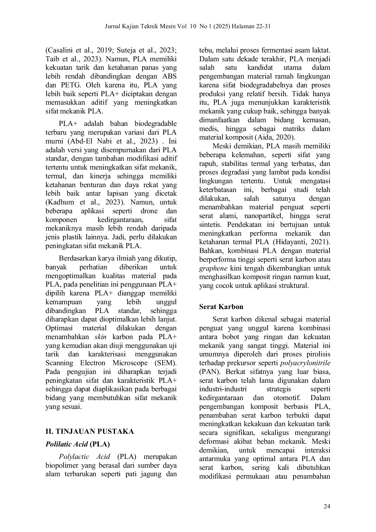 JURNAL KAJIAN TEKNIK MESINJURNAL KAJIAN TEKNIK MESINPLA banyak digunakan dalam proses Fused Deposition Modeling (FDM), tetapi memiliki beberapa keterbatasan terkait sifat mekanik seperti kekuatan, keuletan, dan elastisitas. Untuk mengatasi kekurangan ini, ada kebutuhan untuk mengeksplorasi solusi berkelanjutan untuk meningkatkan kinerja material PLA . Penelitian ini bertujuan untuk menyelidiki dampak karbon skin pada PLA untuk meningkatkan sifat mekaniknya dalam aplikasi FDM. Pendekatan eksperimental melibatkan variasi penerapan komposit karbon pada PLA dengan membuat dua jenis spesimen: PLA karbon non skin dan PLA karbon skin. Spesimen dicetak menggunakan printer 3D Creality K1C dengan kepadatan pengisi 100%, sementara parameter proses lainnya, seperti kecepatan kipas, suhu pelat, dan kecepatan pencetakan, dijaga konstan. Setelah pencetakan, karbon skin diaplikasikan ke permukaan spesimen PLA . Setiap variasi diuji dengan standar ASTM D638 tipe I. Hasil penelitian menunjukkan bahwa spesimen karbon skin PLA menunjukkan kekuatan dan kekakuan yang jauh lebih tinggi tetapi perpanjangan yang lebih rendah, menunjukkan perilaku yang lebih rapuh dibandingkan dengan karbon non skin PLA . Temuan ini menunjukkan bahwa penggunaan komposit karbon dalam PLA dapat secara signifikan meningkatkan kekuatan dan kekakuan sekaligus mengurangi keuletan.