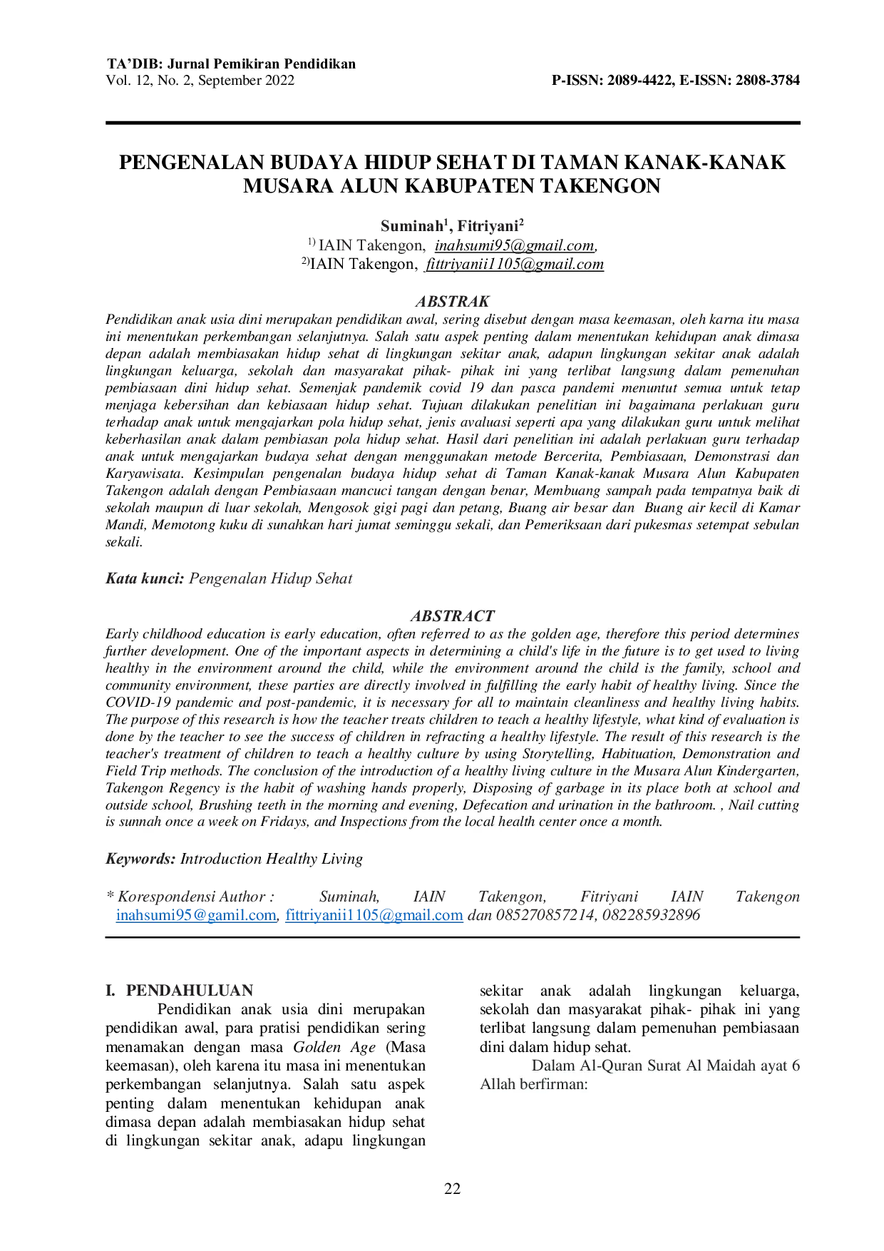 Ta'dib: Jurnal Pemikiran PendidikanTa'dib: Jurnal Pemikiran PendidikanPendidikan anak usia dini merupakan pendidikan awal, sering disebut dengan masa keemasan, oleh karna itu masa ini menentukan perkembangan selanjutnya. Salah satu aspek penting dalam menentukan kehidupan anak dimasa depan adalah membiasakan hidup sehat di lingkungan sekitar anak, adapun lingkungan sekitar anak adalah lingkungan keluarga, sekolah dan masyarakat pihak-pihak ini yang terlibat langsung dalam pemenuhan pembiasaan dini hidup sehat.