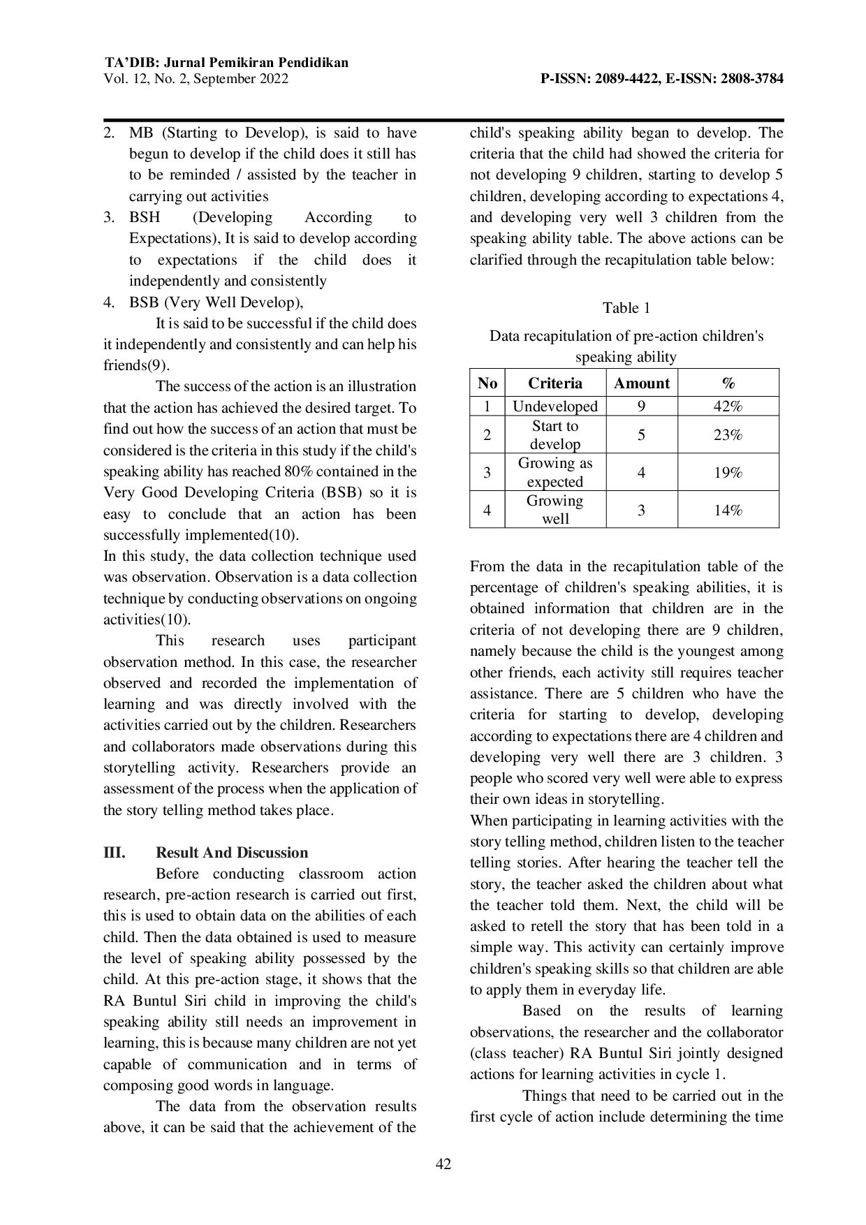 Ta'dib: Jurnal Pemikiran PendidikanTa'dib: Jurnal Pemikiran PendidikanPengembangan kemampuan berbicara merupakan keterampilan penting yang perlu dikembangkan sejak dini. Penelitian ini bertujuan mengetahui kemampuan berbicara anak melalui aktivitas berbicara menggunakan metode story telling di Raudhatul Athfal Buntul Siri. Penelitian menggunakan pendekatan Penelitian Tindakan Kelas (PTK) model Kurt Lewin dengan empat tahap: perencanaan, pelaksanaan, pengamatan, dan refleksi. Subjek penelitian terdiri dari 21 anak kelompok B. Teknik pengumpulan data melalui observasi dan dokumentasi. Hasil menunjukkan peningkatan kemampuan berbicara anak sebesar 80% setelah penerapan metode story telling melalui pembacaan buku cerita, pengulangan cerita sederhana, kesempatan berbicara di depan teman, dan pemberian motivasi oleh guru.
