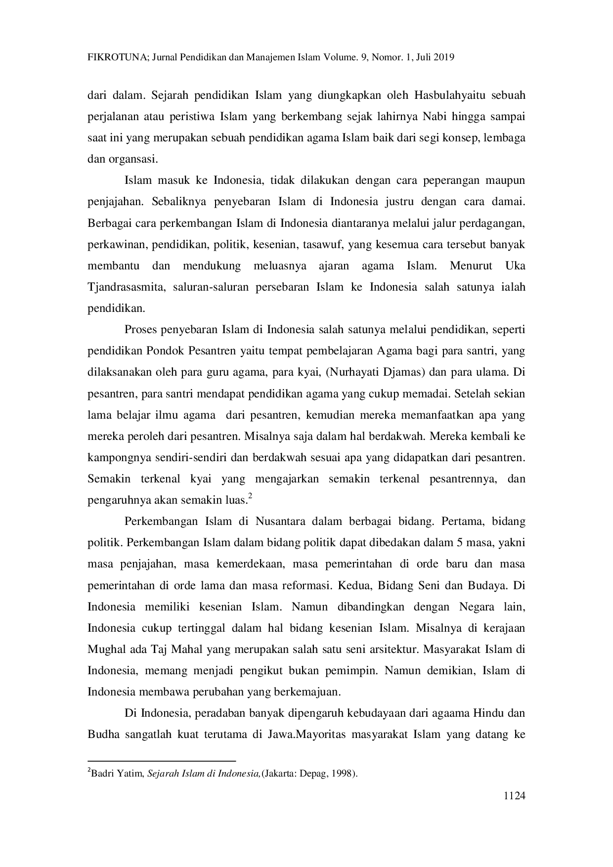 FIKROTUNA: Jurnal Pendidikan dan Manajemen IslamFIKROTUNA: Jurnal Pendidikan dan Manajemen IslamProses masuknya Islam di Indonesia dan hubungannya dengan perkembangan pendidikan Islam pada masa sebelum kedatangan Islam. Peran para muballigh dan pedagang dari Arab yang mengadakan hubungan dagang dengan masyarakat Indonesia sangat membantu proses masuknya Islam di Indonesia. Selain perdagangan, pengembara sufi dan tokoh agama juga ikut andil dalam proses masuknya Islam di Indonesia. Ada beberapa periode sejarah pendidikan Islam diantaranya periode klasik, periode pertengahan dan periode modern. Proses pendidikan Islam pada awalnya tidak hanya ada pada satu tempat dan waktu tertentu, tetapi dimanapun dan kapanpun ketika bertemunya antara muballigh, pedagang, dan penduduk pribumi, maka pada saat itu pula pendidikan Islam berlangsung. Sistem pendidikan Islam pada awalnya berlangsung di lingkungan keluarga, kemudian berkembang di surau, masjid, dan akhirnya masuk di rumah para bangsawan.