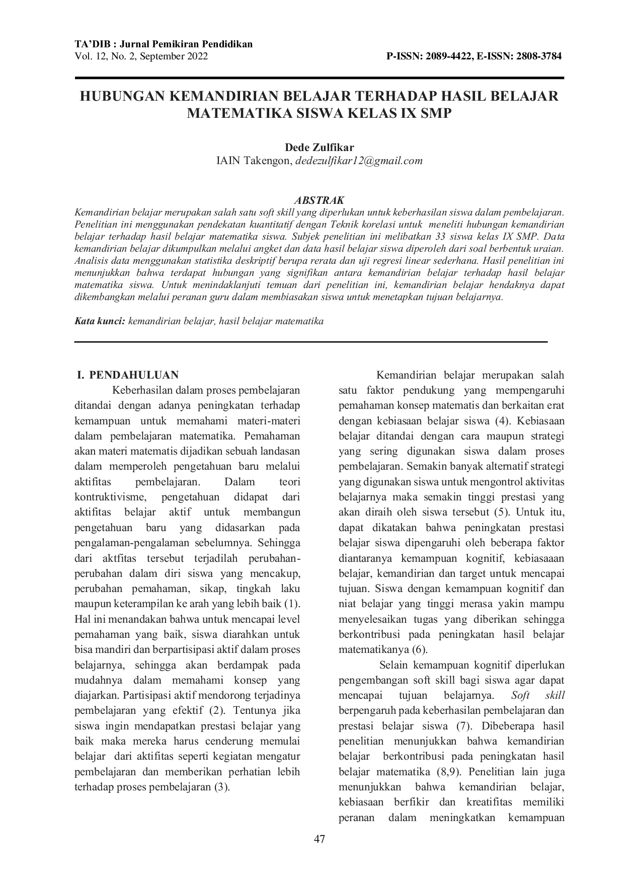 Ta'dib: Jurnal Pemikiran PendidikanTa'dib: Jurnal Pemikiran PendidikanKemandirian belajar merupakan salah satu soft skill yang diperlukan untuk keberhasilan siswa dalam pembelajaran. Penelitian ini menggunakan pendekatan kuantitatif dengan Teknik korelasi untuk meneliti hubungan kemandirian belajar terhadap hasil belajar matematika siswa. Subjek penelitian ini melibatkan 33 siswa kelas IX SMP. Data kemandirian belajar dikumpulkan melalui angket dan data hasil belajar siswa diperoleh dari soal berbentuk uraian. Analisis data menggunakan statistika deskriptif berupa rerata dan uji regresi linear sederhana. Hasil penelitian ini menunjukkan bahwa terdapat hubungan yang signifikan antara kemandirian belajar terhadap hasil belajar matematika siswa. Untuk menindaklanjuti temuan dari penelitian ini, kemandirian belajar hendaknya dapat dikembangkan melalui peranan guru dalam membiasakan siswa untuk menetapkan tujuan belajarnya.