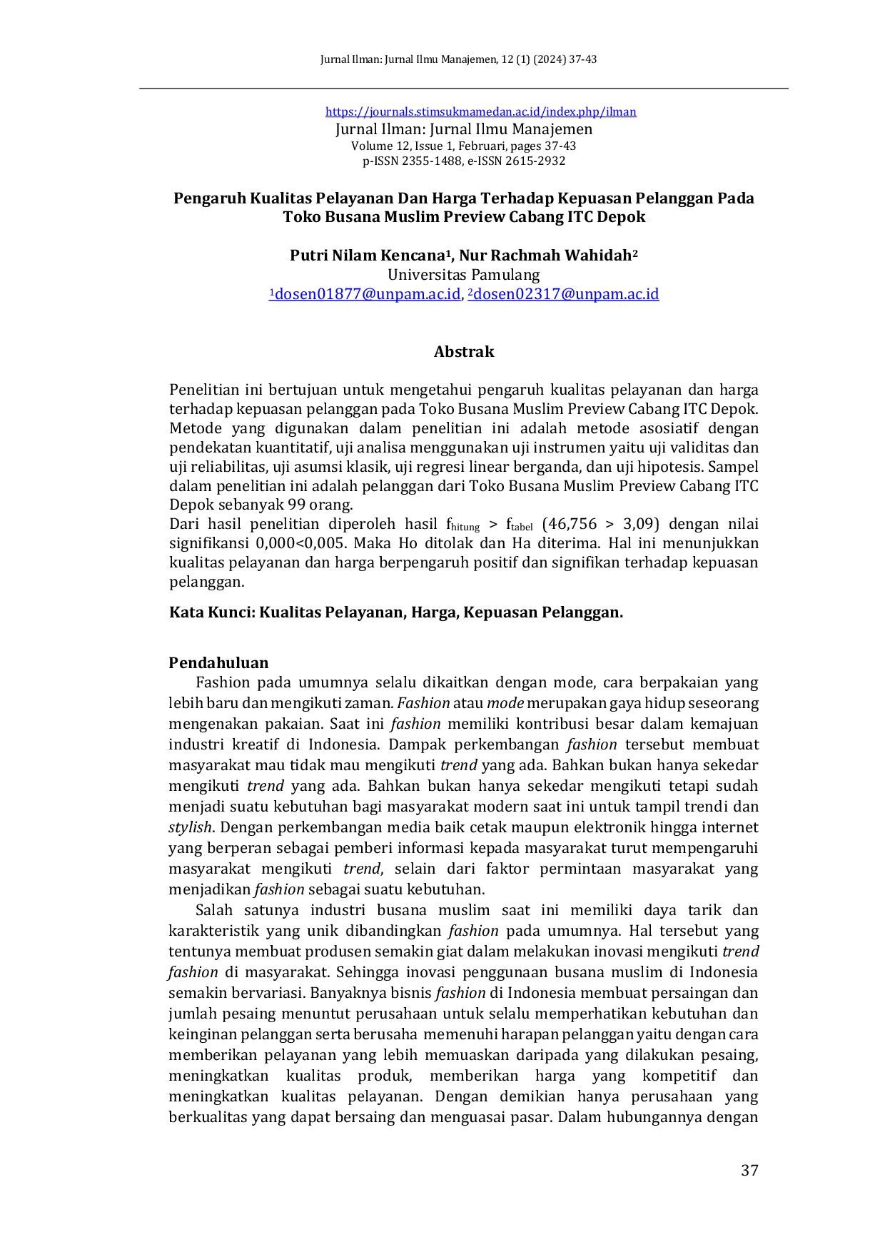 Jurnal ILMAN (Jurnal Ilmu Manajemen)Jurnal ILMAN (Jurnal Ilmu Manajemen)Penelitian ini bertujuan untuk mengetahui . Metode yang digunakan dalam penelitian ini adalah metode asosiatif dengan pendekatan kuantitatif, uji analisa menggunakan uji instrumen yaitu uji validitas dan uji reliabilitas, uji asumsi klasik, uji regresi linear berganda, dan uji hipotesis. Sampel dalam penelitian ini adalah pelanggan dari Toko Busana Muslim Preview Cabang ITC Depok sebanyak 99 orang. Dari hasil penelitian diperoleh hasil fhitung > ftabel (46,756 > 3,09) dengan nilai signifikan 0,000<0,005. Maka Ho ditolak dan Ha diterima. Hal ini menunjukkan kualitas pelayanan dan harga berpengaruh positif dan signifikan terhadap kepuasan pelanggan.