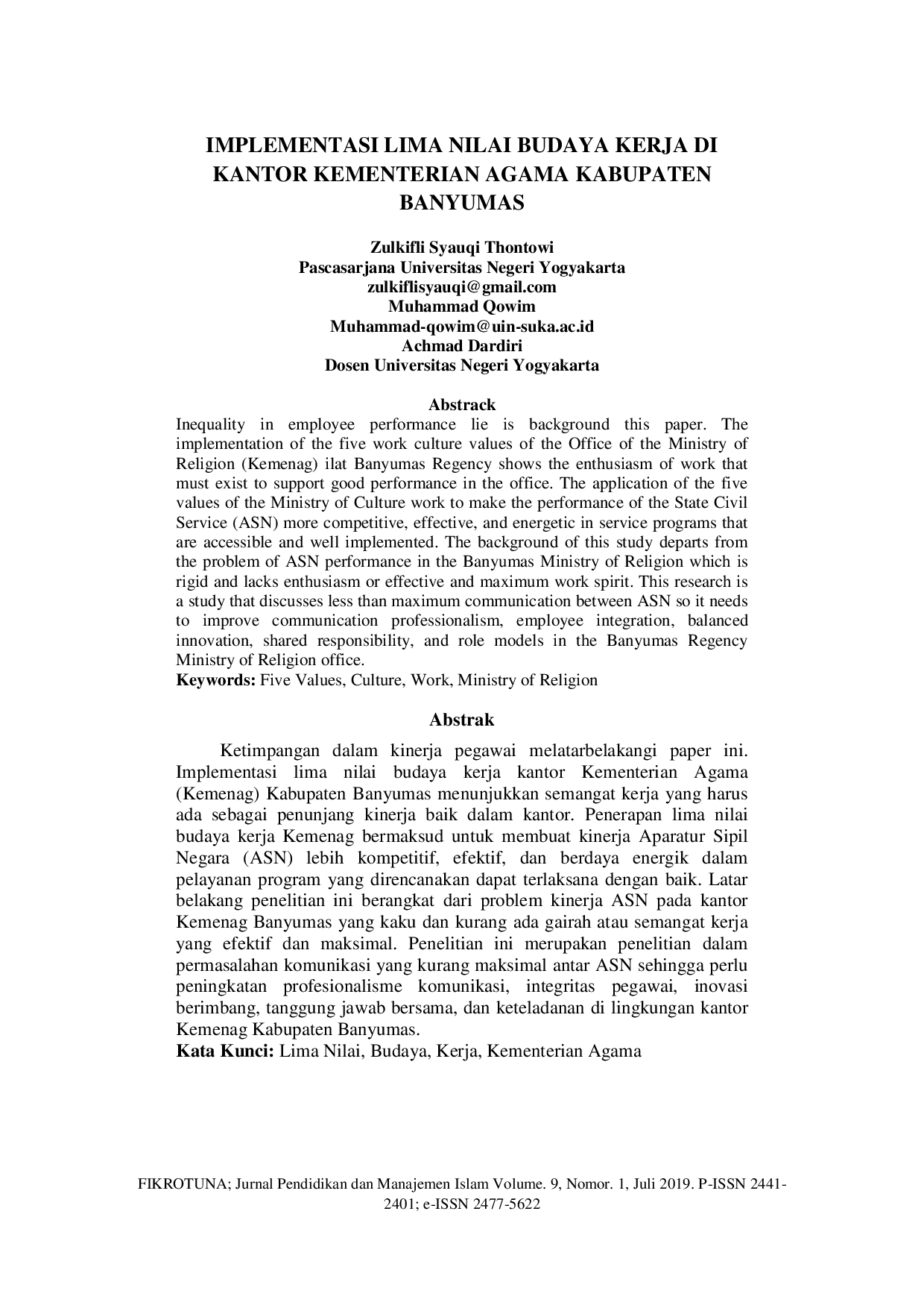 FIKROTUNA: Jurnal Pendidikan dan Manajemen IslamFIKROTUNA: Jurnal Pendidikan dan Manajemen IslamKetimpangan dalam kinerja pegawai melatarbelakangi penelitian ini. Implementasi lima nilai budaya kerja kantor Kementerian Agama (Kemenag) Kabupaten Banyumas menunjukkan semangat kerja yang harus ada sebagai penunjang kinerja baik dalam kantor. Penerapan lima nilai budaya kerja Kemenag bertujuan untuk membuat kinerja Aparatur Sipil Negara (ASN) lebih kompetitif, efektif, dan berdaya energik dalam pelayanan program yang direncanakan dapat terlaksana dengan baik. Latar belakang penelitian ini berangkat dari problem kinerja ASN pada kantor Kemenag Banyumas yang kaku dan kurang ada gairah atau semangat kerja yang efektif dan maksimal. Penelitian ini merupakan penelitian dalam permasalahan komunikasi yang kurang maksimal antar ASN sehingga perlu peningkatan profesionalisme komunikasi, integritas pegawai, inovasi berimbang, tanggung jawab bersama, dan keteladanan di lingkungan kantor Kemenag Kabupaten Banyumas.