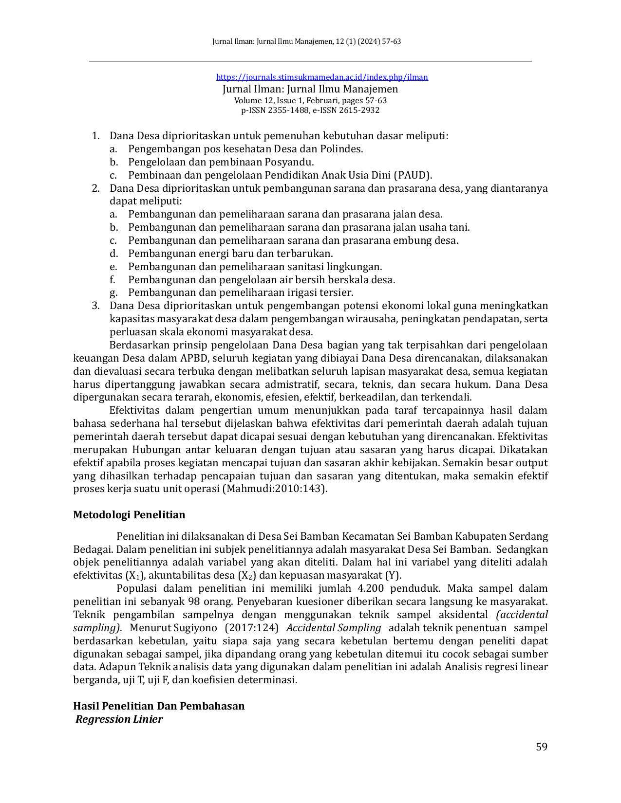 Jurnal ILMAN (Jurnal Ilmu Manajemen)Jurnal ILMAN (Jurnal Ilmu Manajemen)Penelitian ini bertujuan untuk mengetahui secara parsial maupun simultan apakah efektivitas dan akuntabilitas desa berpengaruh signifikan terhadap kepuasan masyarakat di Desa Sei Bamban Kecamatan Sei Bamban Kabupaten Serdang Bedagai, serta seberapa besar persentase pengaruhnya. Metode yang digunakan dalam penelitian ini adalah metode kuantitatif dengan beberapa uji, yaitu reliability analysis, uji penyimpangan asumsi klasik, dan regresi linier. Berdasarkan hasil regresi data primer yang diolah menggunakan SPSS 20, diperoleh persamaan regresi linier berganda sebagai berikut: Y = 13,277 0,270 X1 0,404 X2 e. Secara parsial, variabel efektivitas (X1) memiliki pengaruh yang signifikan terhadap kepuasan masyarakat, terbukti dari nilai t hitung > t tabel (3,259 > 1,985). Sementara itu, variabel akuntabilitas desa (X2) juga memiliki pengaruh yang signifikan terhadap kepuasan masyarakat, terbukti dari nilai t hitung > t tabel (4,274 > 1,985). Secara simultan, variabel efektivitas (X1) dan akuntabilitas desa (X2) memiliki pengaruh yang signifikan terhadap kepuasan masyarakat, terbukti dari nilai F hitung > F tabel (14,217 > 3,09). Variabel efektivitas (X1) dan akuntabilitas desa (X2) mampu memberikan kontribusi pengaruh terhadap variabel kepuasan masyarakat sebesar 23,0%, sedangkan sisanya sebesar 77,0% dipengaruhi oleh variabel lain yang tidak diteliti dalam penelitian ini.
