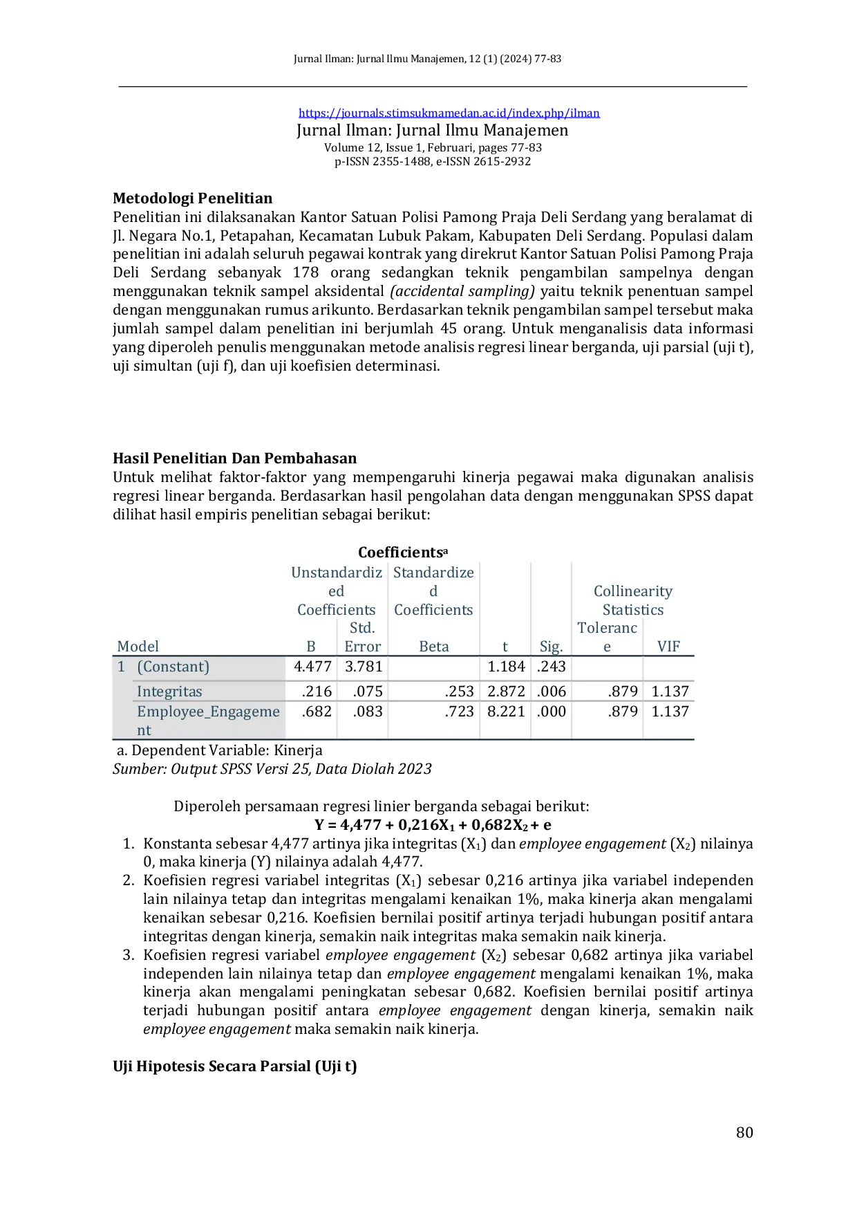 Jurnal ILMAN (Jurnal Ilmu Manajemen)Jurnal ILMAN (Jurnal Ilmu Manajemen)Penelitian ini bertujuan untuk mengetahui apakah integritas dan employee engagement berpengaruh signifikan terhadap kinerja Satpol PP Deli Serdang baik secara parsial maupun simultan, serta seberapa besar pengaruhnya. Metode yang digunakan adalah metode kuantitatif dengan uji reliabilitas, uji asumsi klasik, dan regresi linier. Berdasarkan hasil regresi data primer yang diolah menggunakan SPSS 25, diperoleh persamaan regresi linier berganda: Y = 4,477 0,216X1 0,682X2 e. Secara parsial, variabel integritas (X1) berpengaruh signifikan terhadap kinerja Satpol PP Deli Serdang, sebagaimana dibuktikan oleh nilai t hitung > t tabel (2,872 > 2,018). Variabel employee engagement (X2) juga berpengaruh signifikan terhadap kinerja, dibuktikan dengan nilai t hitung > t tabel (8,221 > 2,018). Secara simultan, kedua variabel tersebut berpengaruh signifikan terhadap kinerja Satpol PP Deli Serdang, sebagaimana ditunjukkan oleh nilai F hitung > F tabel (52,435 > 3,22). Variabel integritas dan employee engagement memberikan kontribusi pengaruh sebesar 71,4% terhadap kinerja, sedangkan 28,6% dipengaruhi oleh variabel lain yang tidak diteliti dalam penelitian ini.