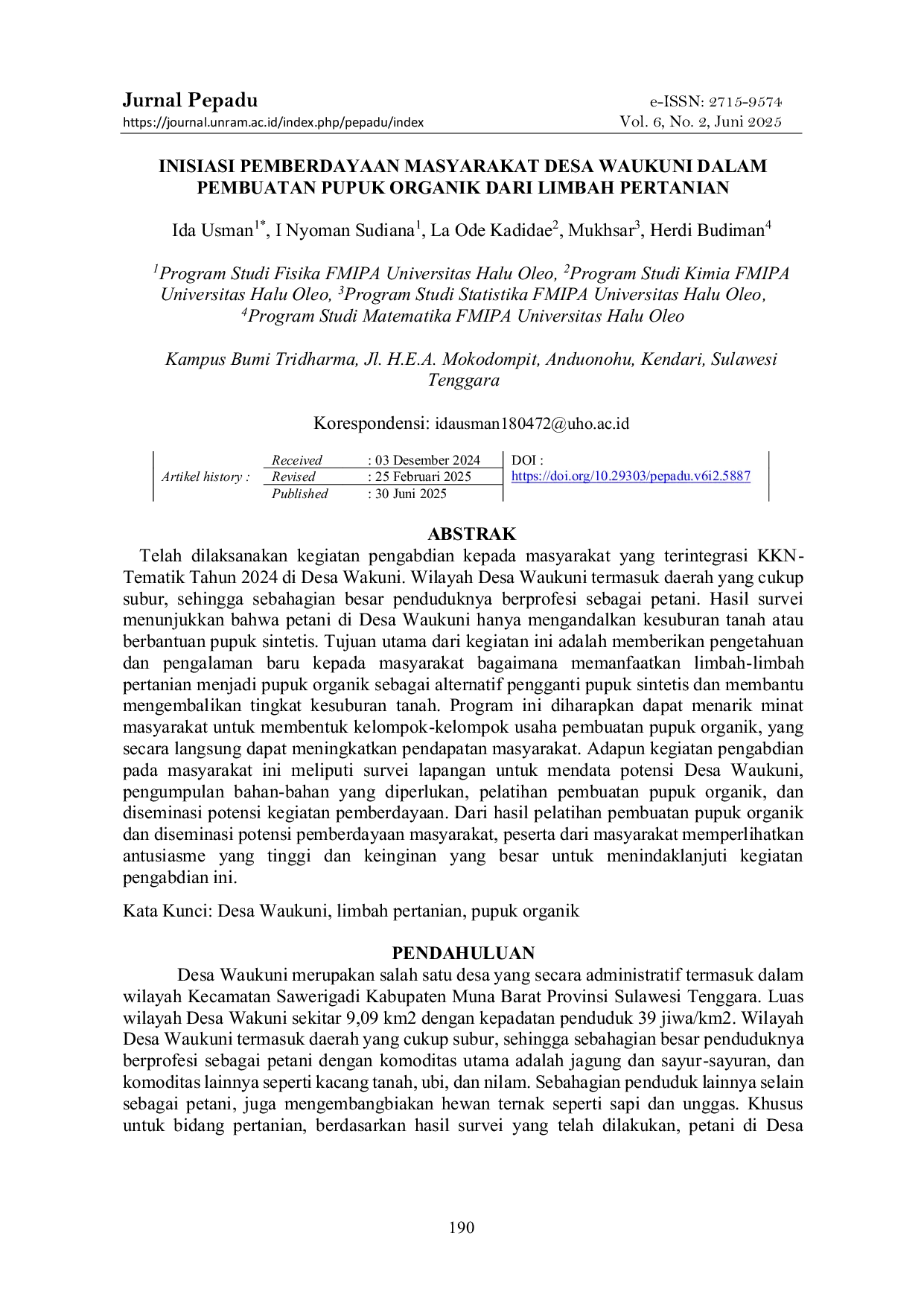 Jurnal PepaduJurnal PepaduTelah dilaksanakan kegiatan pengabdian kepada masyarakat yang terintegrasi KKN-Tematik Tahun 2024 di Desa Waukuni. Wilayah Desa Waukuni termasuk daerah yang cukup subur, sehingga sebahagian besar penduduknya berprofesi sebagai petani. Hasil survei menunjukkan bahwa petani di Desa Waukuni hanya mengandalkan kesuburan tanah atau berbantuan pupuk sintetis. Tujuan utama dari kegiatan ini adalah memberikan pengetahuan dan pengalaman baru kepada masyarakat bagaimana memanfaatkan limbah-limbah pertanian menjadi pupuk organik sebagai alternatif pengganti pupuk sintetis dan membantu mengembalikan tingkat kesuburan tanah. Program ini diharapkan dapat menarik minat masyarakat untuk membentuk kelompok-kelompok usaha pembuatan pupuk organik, yang secara langsung dapat meningkatkan pendapatan masyarakat. Adapun kegiatan pengabdian pada masyarakat ini meliputi survei lapangan untuk mendata potensi Desa Waukuni, pengumpulan bahan-bahan yang diperlukan, pelatihan pembuatan pupuk organik, dan diseminasi potensi kegiatan pemberdayaan. Dari hasil pelatihan pembuatan pupuk organik dan diseminasi potensi pemberdayaan masyarakat, peserta dari masyarakat memperlihatkan antusiasme yang tinggi dan keinginan yang besar untuk menindaklanjuti kegiatan pengabdian ini.