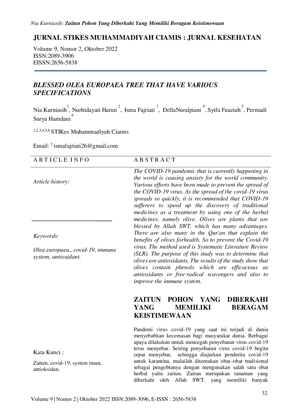 JURNAL KESEHATAN STIKes MUHAMMADIYAH CIAMISJURNAL KESEHATAN STIKes MUHAMMADIYAH CIAMISPandemi virus covid-19 yang saat ini terjadi di dunia menyebabkan kecemasan bagi masyarakat dunia. Berbagai upaya dilakukan untuk mencegah penyebaran virus covid-19 terus menyebar. Seiring penyebaran virus covid-19 begitu cepat, sehingga diajurkan penderita covid-19 untuk karantina, mulailah ditemukan obat–obat tradisional sebagai pengobatannya dengan menggunakan salah satu obat herbal yaitu zaitun. Zaitun merupakan tanaman yang diberkahi oleh Allah SWT. yang memiliki banyak keistimewaan. Banyak juga dalam Al-Quran yang menjelaskan manfaat zaitun bagi kesehatan. Metode yang digunakan yaitu Systematic Literatur Riview (SLR). Tujuan penelitian ini untuk mengetahui bahwa zaitun sebagai antioksidan. Hasil dari penelitian bahwa zaitun memiliki kandungan fenol yang berkhasiat sebagai antioksidan atau penangkal radikal bebas dan juga untuk meningkatkan sistem imun.
