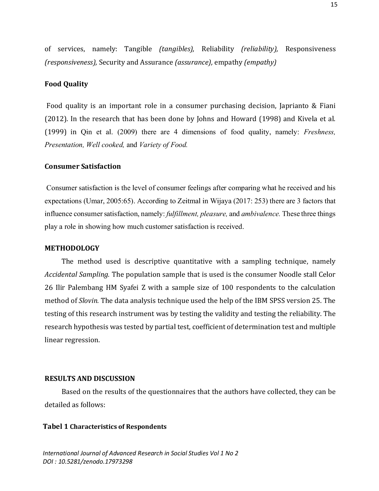 International Journal of Advanced Research in Social StudiesInternational Journal of Advanced Research in Social StudiesThis study aims to determine the effect of service quality on consumer satisfaction at Mie Celor 26 Ilir H.M Syafei Z Palembang. The methodology used in this research is descriptive quantitative. The accidental sampling technique was applied. The participants were consumers at the stall by a total of 100 respondents. Based on the t-test, the value of t-count was higher than t-table (3.860 > 1.984). It means that service quality has a significant effect on consumer satisfaction. While in the calculation of the coefficient of determination, the result obtained was 55%. Cornbachs Alpha value on service quality also showed that it was higher than the crisis value, which was 0.902, and then the variable was declared reliable since exceeded 0.600.
