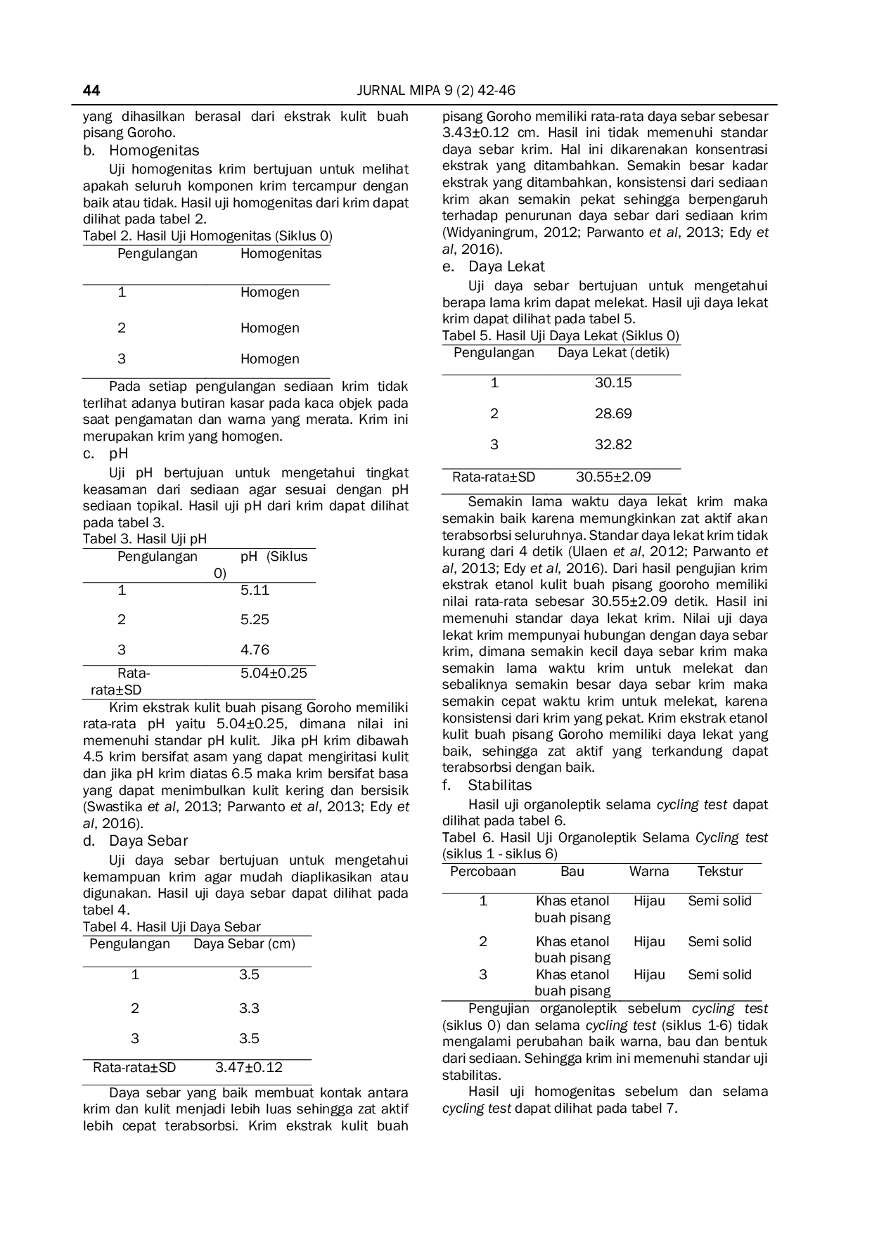 Berdasarkan hasil evaluasi fisik krim ekstrak etanol kulit buah pisang Goroho konsentrasi 12.5%, telah memenuhi standar organoleptik, homogenitas, pH dan daya lekat tetapi belum memenuhi standar daya sebar krim.Pada uji stabilitas krim, hasil statistika menunjukkan tidak ada perbedaan yang bermakna pada setiap evaluasi fisik krim, sehingga krim ekstrak kulit buah pisang Goroho merupakan krim yang stabil.
