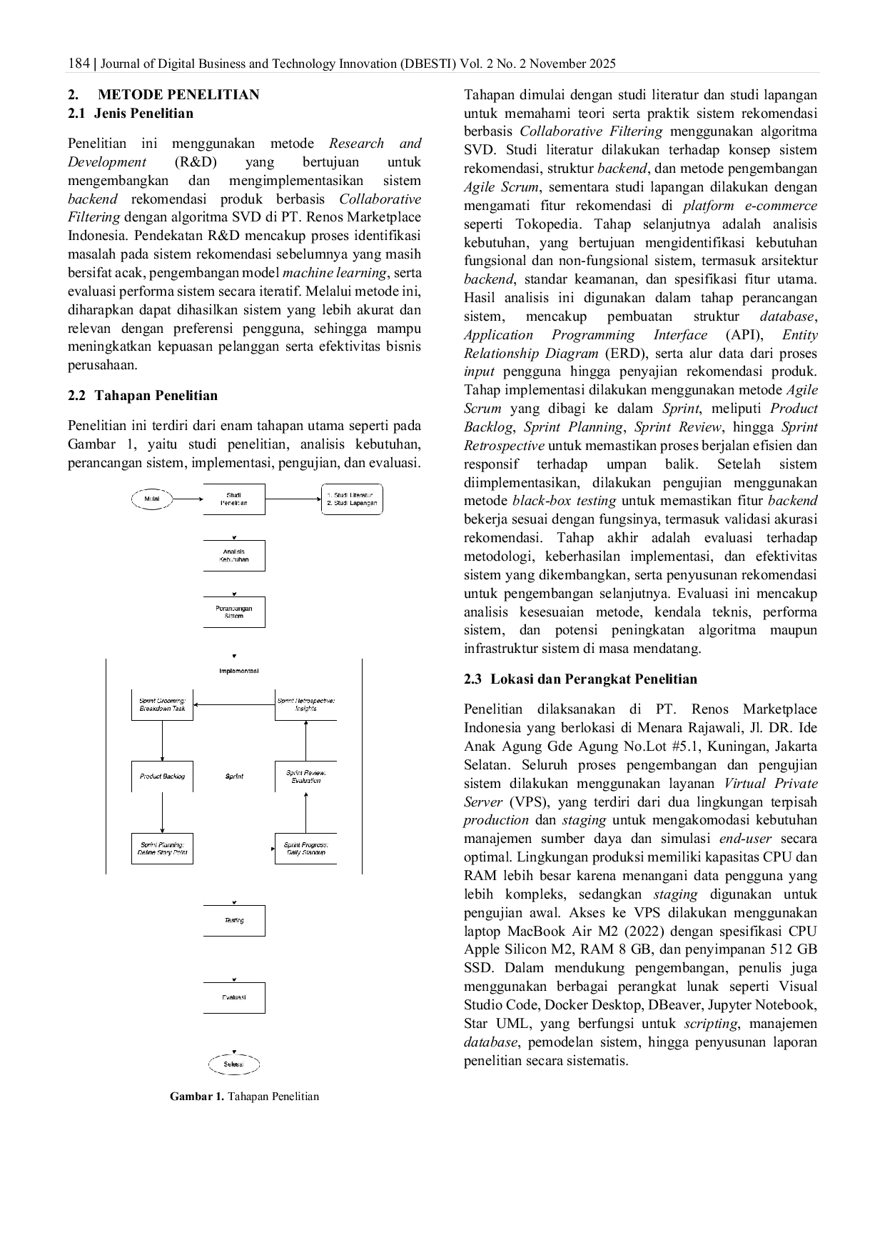 DBESTI: Journal of Digital Business and Technology InnovationDBESTI: Journal of Digital Business and Technology InnovationSistem rekomendasi telah menjadi komponen penting dalam meningkatkan pengalaman pengguna di platform e-commerce, termasuk di PT. Renos Marketplace Indonesia. Namun, sistem rekomendasi sebelumnya masih bersifat acak dan belum mampu menyesuaikan dengan preferensi pengguna. Penelitian ini bertujuan mengembangkan sistem backend rekomendasi produk berbasis Collaborative Filtering menggunakan algoritma Singular Value Decomposition (SVD). Metodologi yang digunakan adalah Research and Development (R&D) dengan pendekatan Agile Scrum serta evaluasi performa menggunakan metrik RMSE, MSE, dan MAE. Sistem dibangun menggunakan FastAPI, PostgreSQL, dan Python, serta diuji secara fungsional melalui metode blackbox testing. Hasil implementasi menunjukkan nilai RMSE sebesar 0,1886; MSE sebesar 0,0366; dan MAE sebesar 0,1242 yang menandakan akurasi prediksi sangat baik. Selain itu, hasil survei terhadap 11 responden internal menunjukkan rata-rata kepuasan di atas 80%, dengan skor tertinggi sebesar 90,91% pada pernyataan bahwa sistem meningkatkan peluang pembelian. Temuan ini menunjukkan bahwa algoritma SVD efektif dalam menghasilkan rekomendasi yang relevan dan personal. Penelitian ini menyimpulkan bahwa sistem backend rekomendasi yang dikembangkan berhasil meningkatkan efisiensi dan relevansi rekomendasi, serta membuka peluang pengembangan lebih lanjut dengan integrasi perilaku pengguna yang lebih kompleks.
