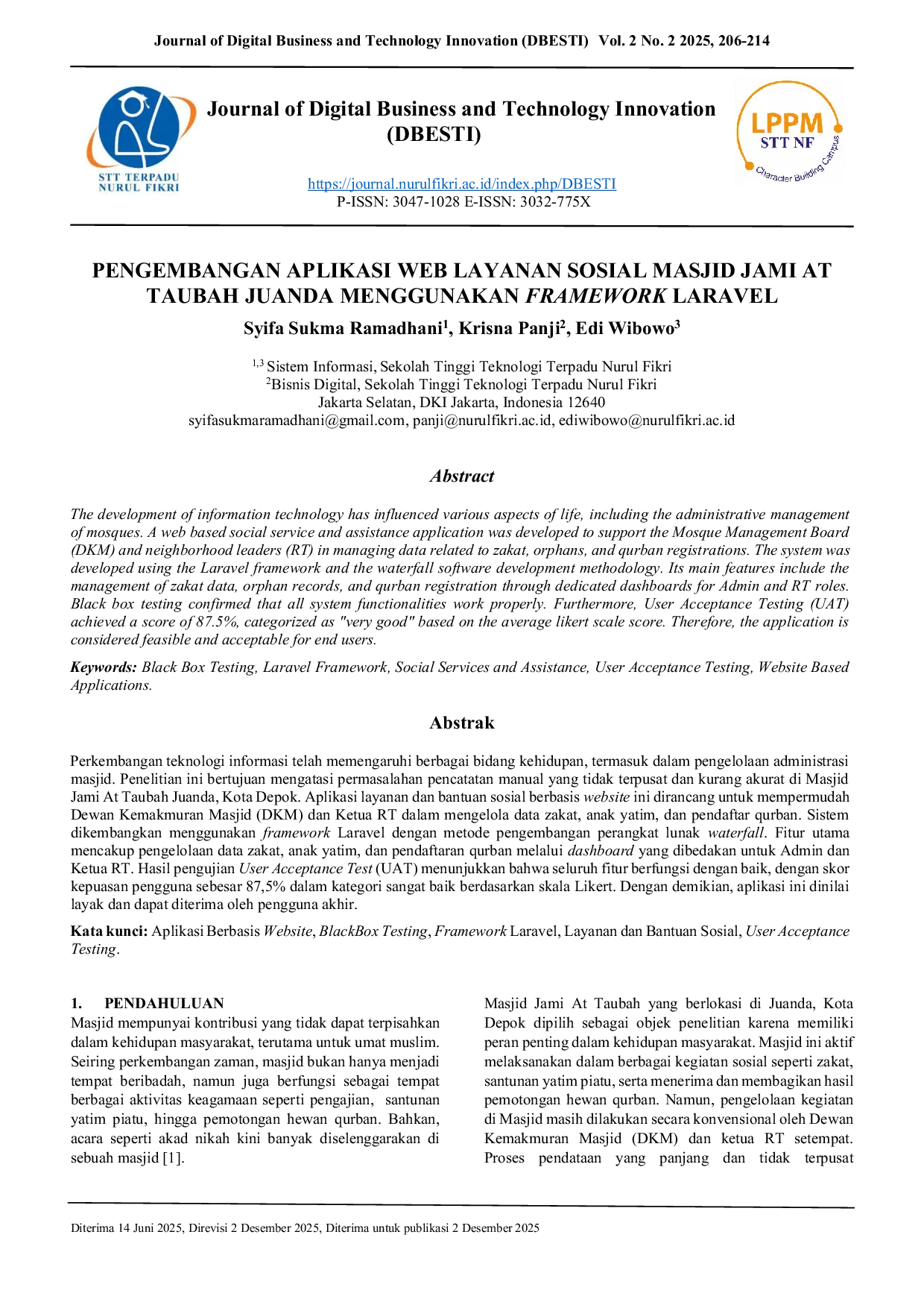 DBESTI: Journal of Digital Business and Technology InnovationDBESTI: Journal of Digital Business and Technology InnovationPerkembangan teknologi informasi telah memengaruhi berbagai bidang kehidupan, termasuk dalam pengelolaan administrasi masjid. Penelitian ini bertujuan mengatasi permasalahan pencatatan manual yang tidak terpusat dan kurang akurat di Masjid Jami At Taubah Juanda, Kota Depok. Aplikasi layanan dan bantuan sosial berbasis website ini dirancang untuk mempermudah Dewan Kemakmuran Masjid (DKM) dan Ketua RT dalam mengelola data zakat, anak yatim, dan pendaftar qurban. Sistem dikembangkan menggunakan framework Laravel dengan metode pengembangan perangkat lunak waterfall. Fitur utama mencakup pengelolaan data zakat, anak yatim, dan pendaftaran qurban melalui dashboard yang dibedakan untuk Admin dan Ketua RT. Hasil pengujian User Acceptance Test (UAT) menunjukkan bahwa seluruh fitur berfungsi dengan baik, dengan skor kepuasan pengguna sebesar 87,5% dalam kategori sangat baik berdasarkan skala Likert. Dengan demikian, aplikasi ini dinilai layak dan dapat diterima oleh pengguna akhir.