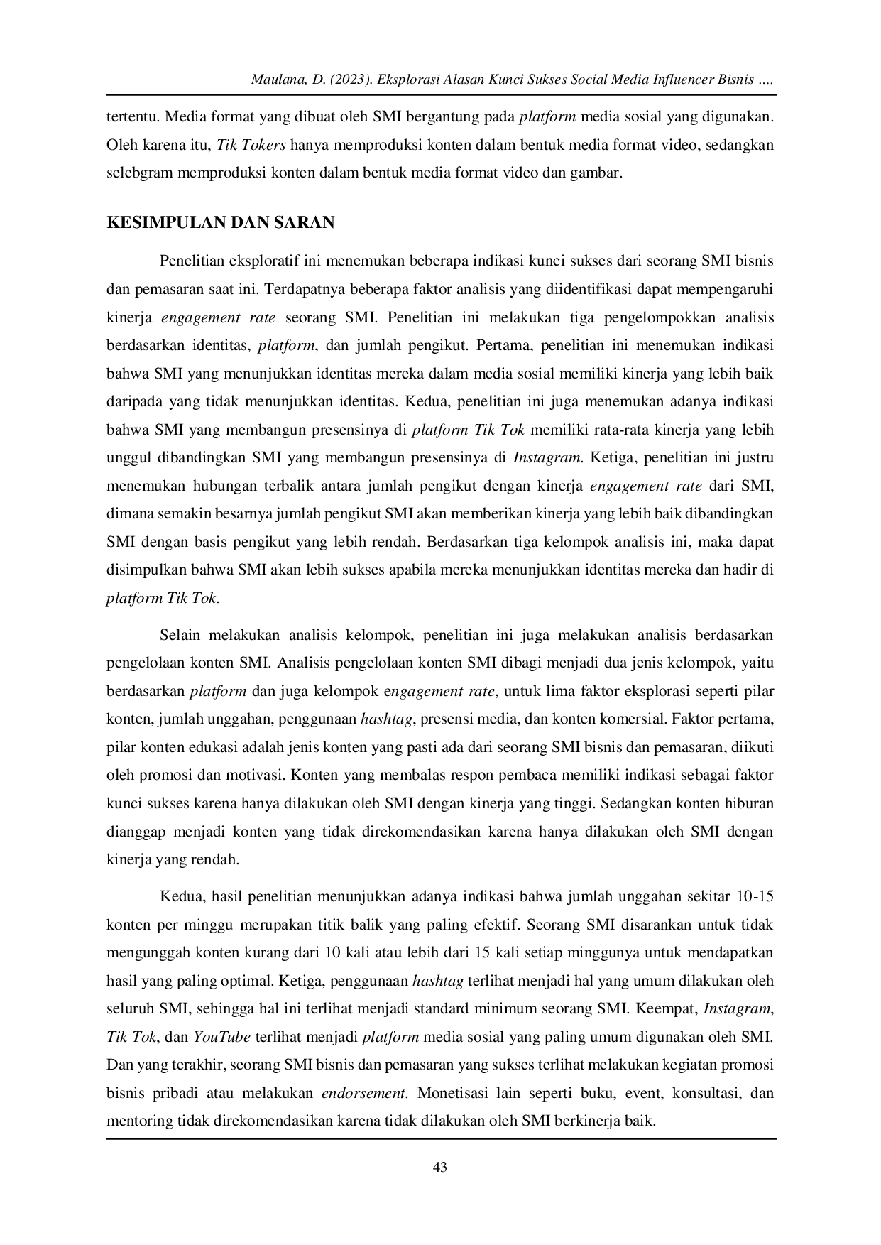 Penelitian eksploratif ini menemukan beberapa indikasi kunci sukses dari seorang SMI bisnis dan pemasaran saat ini.Terdapatnya beberapa faktor analisis yang diidentifikasi dapat mempengaruhi kinerja engagement rate seorang SMI.Penelitian ini melakukan tiga pengelompokkan analisis berdasarkan identitas, platform, dan jumlah pengikut.Pertama, penelitian ini menemukan indikasi bahwa SMI yang menunjukkan identitas mereka dalam media sosial memiliki kinerja yang lebih baik daripada yang tidak menunjukkan identitas.Kedua, penelitian ini juga menemukan adanya indikasi bahwa SMI yang membangun presensinya di platform Tik Tok memiliki rata-rata kinerja yang lebih unggul dibandingkan SMI yang membangun presensinya di Instagram.Ketiga, penelitian ini justru menemukan hubungan terbalik antara jumlah pengikut dengan kinerja engagement rate dari SMI, dimana semakin besarnya jumlah pengikut SMI akan memberikan kinerja yang lebih baik dibandingkan SMI dengan basis pengikut yang lebih rendah.Berdasarkan tiga kelompok analisis ini, maka dapat disimpulkan bahwa SMI akan lebih sukses apabila mereka menunjukkan identitas mereka dan hadir di platform Tik Tok.