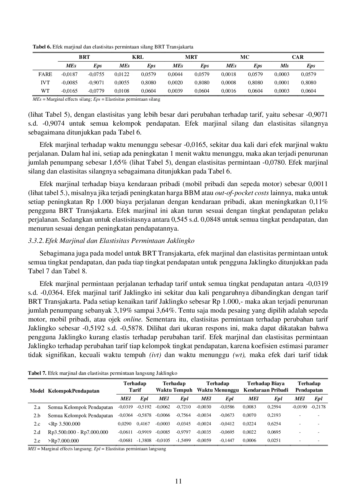 Jurnal Transportasi MultimodaJurnal Transportasi MultimodaWacana kenaikan tarif BRT Transjakarta yang ditetapkan sejak tahun 2005 sering muncul di media massa. Untuk memberikan bukti respons penumpang terhadap tarif tersebut, penelitian ini dilakukan. Adapun tujuan penelitian ini adalah untuk mengestimasi efek marjinal dan elastisitas permintaan dua jenis pelayanan, yaitu BRT Transjakarta dan Jaklingko. Metode penghitungan efek marjinal dan elastisitas menggunakan multinomial logit model (MNL) dan conditional logit model (CLM). Pengumpulan data dilakukan dengan menggunakan stated preference survey terhadap 1.202 responden, yang terdiri dari 621 responden BRT Transjakarta dan 581 responden Jaklingko. Berbeda dengan penelitian yang pernah dilakukan di Jakarta sebelumnya, penelitian ini langsung mengestimasi tarif, waktu perjalanan, waktu menunggu, dan biaya transportasi kendaraan pribadi. Selain itu, penelitian ini juga menganalisis efek marjinal dan elastisitas terhadap tingkat pendapatan pengguna secara langsung, yaitu dengan memasukkan tingkat pendapatan di dalam model, dan juga membuat model yang berbeda untuk tingkat pendapatan yang berbeda. Dari hasil penelitian, ditemukan efek marjinal permintaan BRT Jakarta rata-rata -0,0187, dengan elastisitas sekitar -0,0757, yang menunjukkan elastisitas permintaan terhadap tarif tidak elastis. Demikian pun terhadap waktu perjalanan dengan efek marjinal sekitar separuh dari tarif, yaitu -0,0085 dan elastisitas -0,9074. Untuk waktu tunggu, efek marjinal sekitar dua kali dibandingkan waktu tempuhnya, yaitu sebesar -0,0165, dengan elastisitas -0,0780, dan untuk biaya perjalanan kendaraan pribadi dengan efek marjinal 0,0011 dan elastisitas 0,0848. Sedangkan untuk tingkat pendapatan dengan efek marjinal 0,0061, atau permintaan akan meningkat 0,61% setiap terjadi Rp 1 juta peningkatan pendapatan pengguna, dengan elastisitas 0,0546. Efek marjinal dan elastisitas ini menurun pada tingkat pendapatan yang lebih tinggi. Hal yang sama terjadi pada pelayanan Jaklingko. Secara umum, efek marjinal dan elastisitas Jaklingko lebih tinggi dibandingkan dengan BRT Transjakarta.