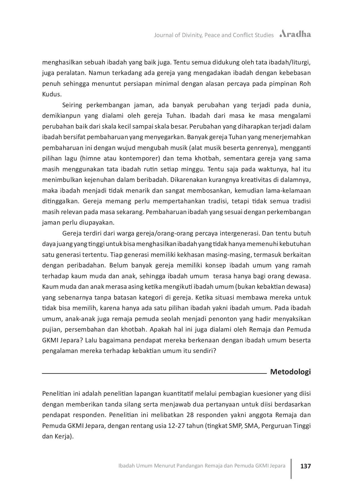 Aradha: Journal of Divinity, Peace and Conflict StudiesAradha: Journal of Divinity, Peace and Conflict StudiesArtikel ini bertujuan untuk menggambarkan pandangan anak muda terhadap ibadah yang selama ini mereka ikuti. Ibadah bukan hanya dijalankan berdasarkan rutinitas saja. Lebih dalam dari itu perlu pemahaman yang benar mengenai ibadah: dasar, pusat, visi, misi dan harapan dalam ibadah. Sebagian orang Kristen ketika pulang dari gereja merasa kecewa dengan ibadah yang tidak sesuai dengan seleranya. Namun ibadah bukanlah demi mencari kesenangan diri manusia melainkan wujud pengabdian manusia kepada Tuhan yang menjadi inisiator dalam ibadah. Dalam pelaksanaannya, ibadah selalu mengalami perkembangan dari masa ke masa dengan tetap memegang prinsip-prinsip kebenaran dasar dalam beribadah. Wujud dan ekspresi ibadah yang beragam merupakan kekayaan cara bagaimana umat bersukacita atas karya Allah melalui keselamatan yang mereka terima. Ibadah juga bersifat terbuka bagi semua orang tanpa batas, sebagaimana anugerah Allah yang diberikan kepada semua orang.
