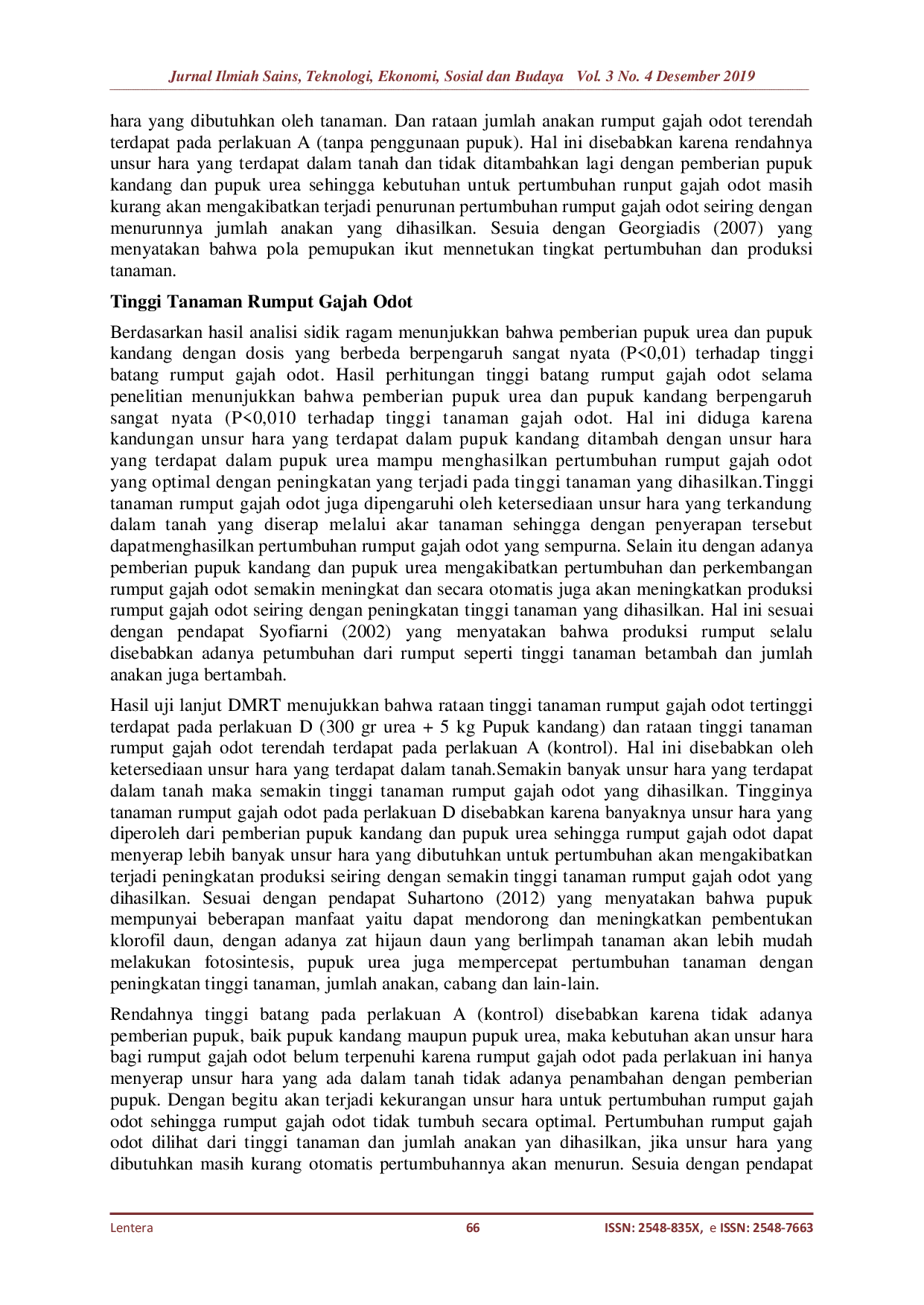 Berdasarkan hasil penelitian ini dapat disimpulkan bahwa pemberian pupuk urea dan pupuk kandang dengan dosis 300 gram urea 5 kg pupuk kandang dapat meningkatkan produksi rumput gajah odot.Peningkatan tersebut terlihat dari jumlah anakan dan tinggi batang, serta menghasilkan struktur tanah yang gembur dan cocok untuk penanaman rumput gajah odot.Produksi rumput gajah odot yang diperoleh adalah 20 kg dengan rataan jumlah anakan 17,50 dan tinggi batang 117,50 cm.