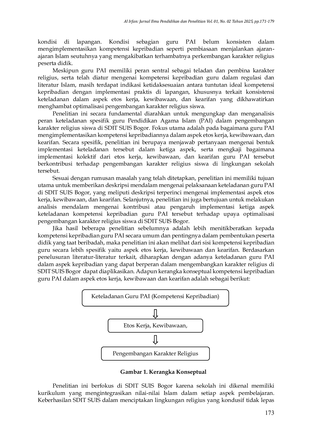 Penelitian ini menunjukkan bahwa kompetensi kepribadian guru Pendidikan Agama Islam (PAI) di SDIT SUIS Bogor, yang meliputi aspek etos kerja, kewibawaan, dan kearifan, berkontribusi signifikan terhadap pengembangan karakter religius siswa.Meskipun aspek etos kerja guru PAI secara umum cukup baik namun memerlukan peningkatan dalam disiplin waktu dan penunaian tugas administrasi, hal ini tetap menjadi landasan penting bagi pengembangan kedisiplinan dan tanggung jawab siswa.Oleh karena itu, ketiga aspek kompetensi kepribadian ini berfungsi sebagai pondasi moral yang efektif dalam mengembangkan karakter religius peserta didik secara nyata dan berkelanjutan.