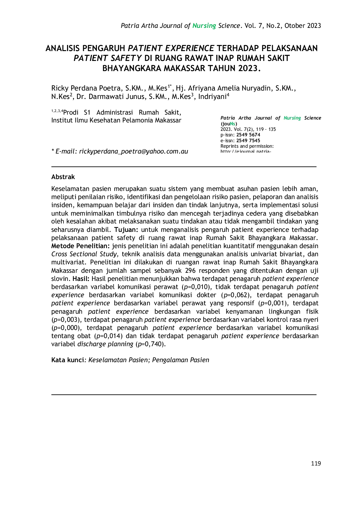 One moment, please...One moment, please...Keselamatan pasien merupakan suatu sistem yang membuat asuhan pasien lebih aman, meliputi penilaian risiko, identifikasi dan pengelolaan risiko pasien, pelaporan dan analisis insiden, kemampuan belajar dari insiden dan tindak lanjutnya, serta implementasi solusi untuk meminimalkan timbulnya risiko dan mencegah terjadinya cedera yang disebabkan oleh kesalahan akibat melaksanakan suatu tindakan atau tidak mengambil tindakan yang seharusnya diambil. Tujuan: untuk menganalisis pengaruh patient experience terhadap pelaksanaan patient safety di ruang rawat inap Rumah Sakit Bhayangkara Makassar. Metode Penelitian: jenis penelitian ini adalah penelitian kuantitatif menggunakan desain Cross Sectional Study, teknik analisis data menggunakan analisis univariat bivariat, dan multivariat. Penelitian ini dilakukan di ruangan rawat inap Rumah Sakit Bhayangkara Makassar dengan jumlah sampel sebanyak 296 responden yang ditentukan dengan uji slovin. Hasil: Hasil penelitian menunjukkan bahwa terdapat pengaruh patient experience berdasarkan variabel komunikasi perawat (p=0,010), tidak terdapat pengaruh patient experience berdasarkan variabel komunikasi dokter (p=0,062), terdapat pengaruh patient experience berdasarkan variabel perawat yang responsif (p=0,001), terdapat pengaruh patient experience berdasarkan variabel kenyamanan lingkungan fisik (p=0,003), terdapat pengaruh patient experience berdasarkan variabel kontrol rasa nyeri (p=0,000), terdapat pengaruh patient experience berdasarkan variabel komunikasi tentang obat (p=0,014) dan tidak terdapat pengaruh patient experience berdasarkan variabel discharge planning (p=0,740).